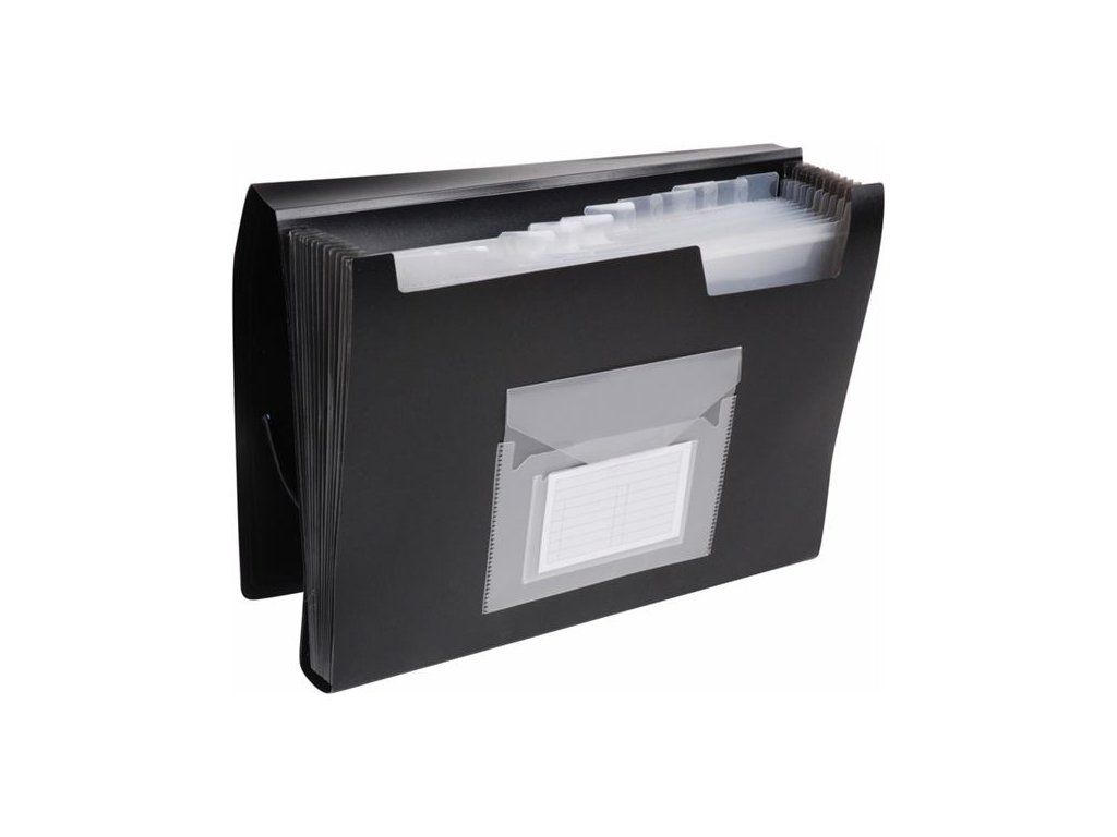 Aktovka s přihrádkami na dokumenty do formátu A4, vyrobená z odolného polypropylenu, s jednou kapsou pod přední klopou pro uložení 2 CD/DVDUzavírání na gumičku v barvě desek, umístěnou v rozích13 průhledných rozšiřujících se kapesŠířka hřbetu: 37 mmTloušťka materiálu - obálka: 650 micTloušťka materiálu - vnitřní kapsy: 175 micKapsička na CD/DVDBarva: černáDoplňkové parametry