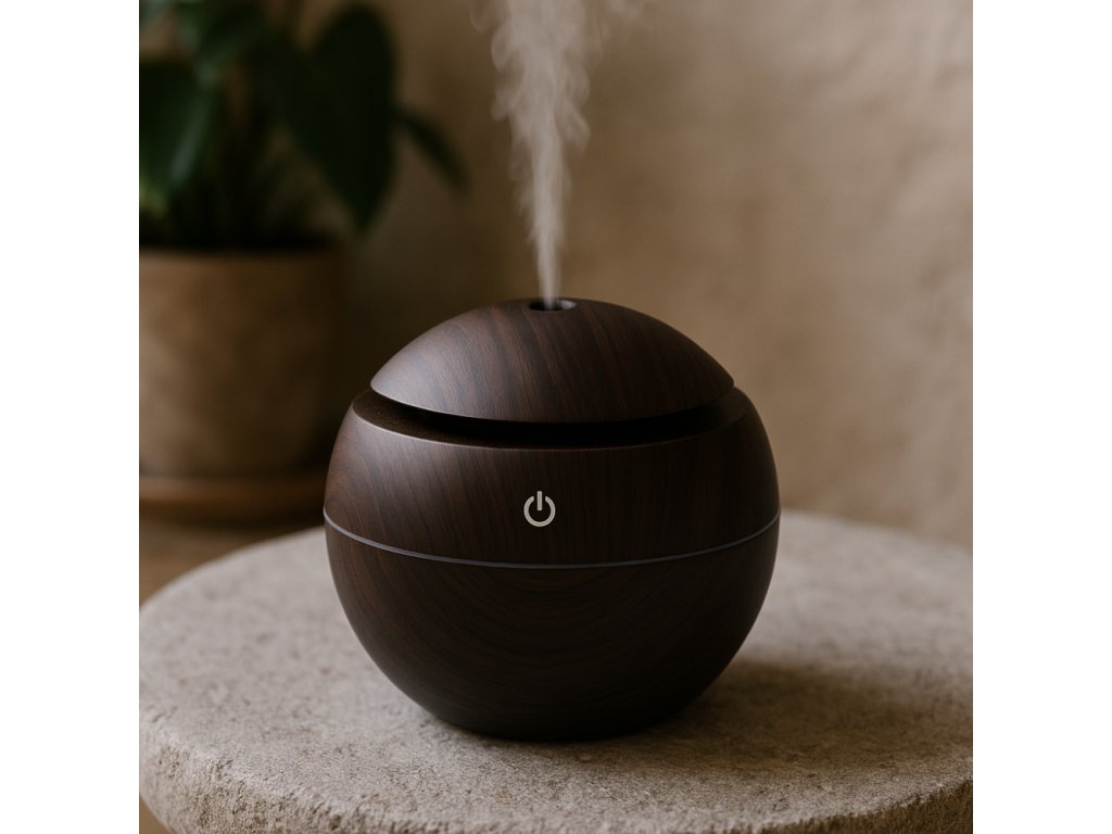 Elegantní zvlhčovač vzduchu z kvalitního PP materiálu v barvě ořechu, který zlepšuje kvalitu ovzduší a zároveň provoní interiér. Součástí balení je 6 skleněných lahviček s vonnými oleji, které navozují různé atmosféry – od klidné meditace až po osvěžující optimismus. Zvlhčovač se snadno používá díky USB napájení, ideální pro domácí i kancelářské prostředí.