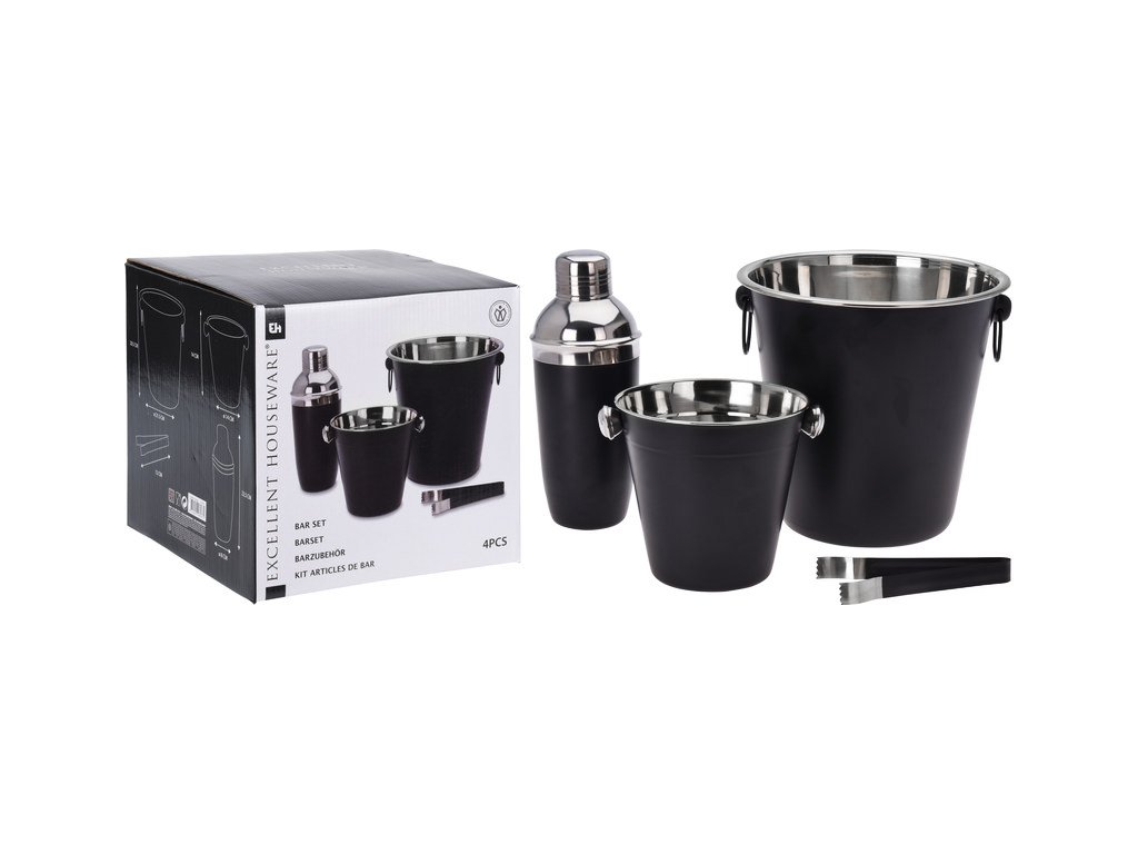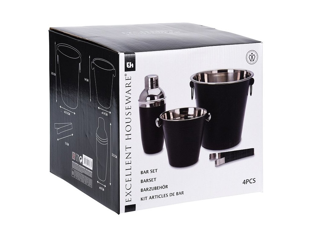 - kompletní barmanský set v atraktivním černo/nerezovém provedení- materiál: nerezová ocel- matný černý povrch, nerezové vnitřní části- kvalitní provedení, dlouhá životnost- vhodné do myčky nádobí, pro zachování dlouhotrvajícího dokonalého vzhledu se však doporučuje ruční mytí- kompletní sada 4 ks obsahuje:- 1x shaker na koktejly s víčkem a sítkem: objem 0.5 l / výška 22.5 cm- 1x kyblík na led: horní průměr 14 x výška 14 cm- 1x kyblík na víno, sekt či šampaňské: horní průměr 20 x výška 21.5 cm- 1x kleště na led 12 cmDoplňkové parametry