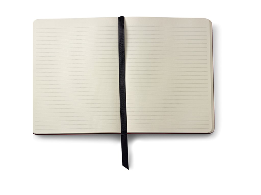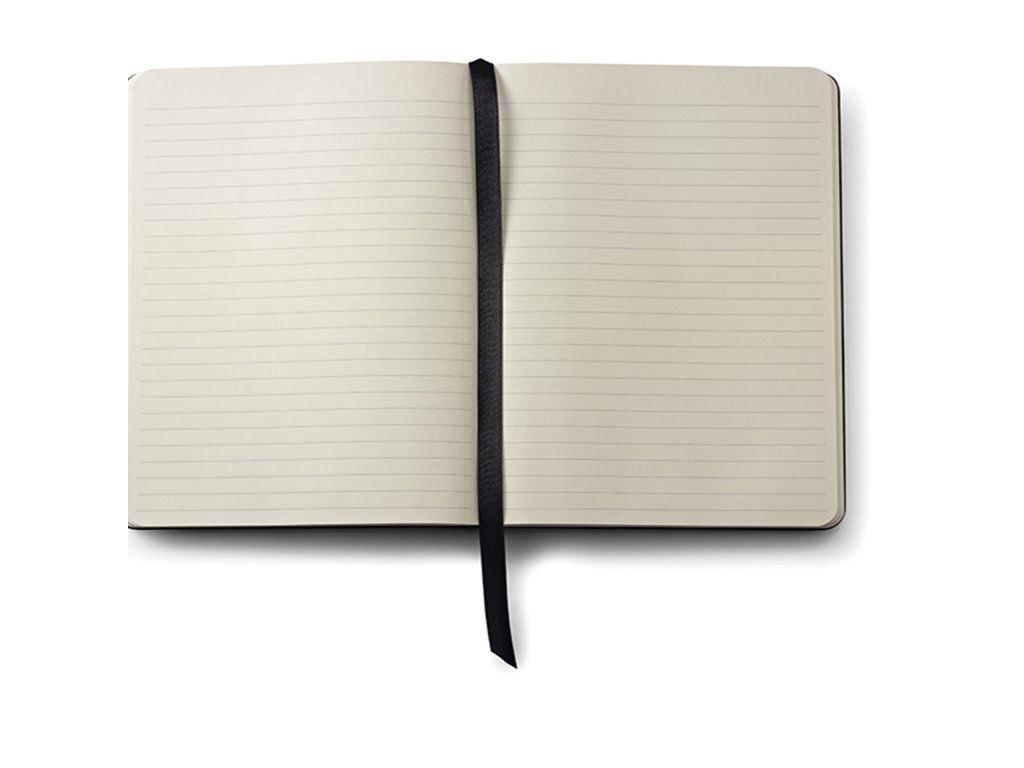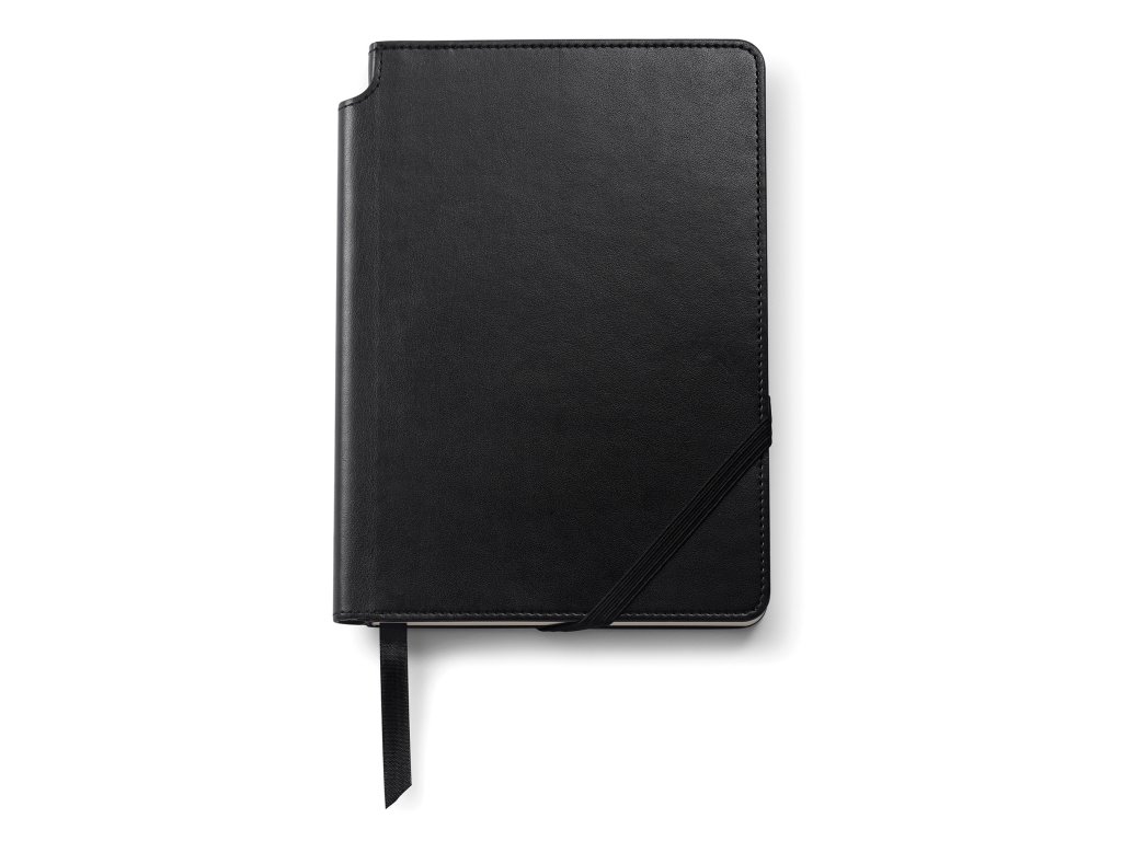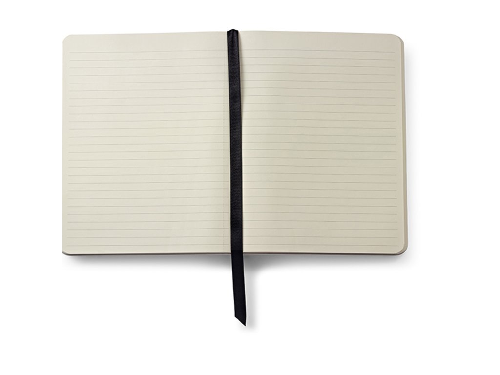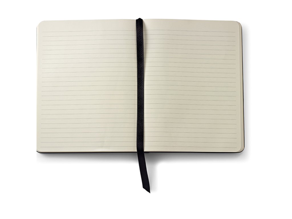 Linkovaný zápisník s deskami z černé umělé kůže. Zavírání na gumičku přes spodní roh. Ve hřbetu zápisníku je kapsička na pero. Velikost zápisníku Medium (155x212 mm). 160 perforovaných stránek. Gramáž linkovaného papíru 100g/m2.Doplňkové parametry