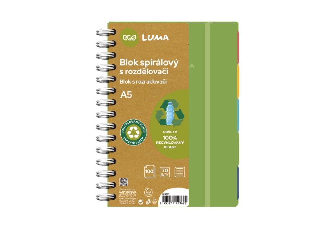 praktický blok s listy z recyklovaného papíru, s certifikací Global recycled standard, linkovaný, 100 listů, papír 70 g potištěný sójovým inkoustem, 5 barevných rozlišovačů, obálka 100% recyklovaný plastDoplňkové parametry