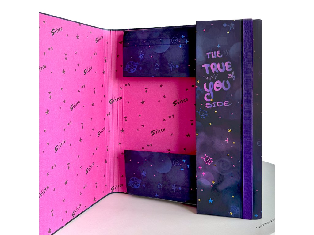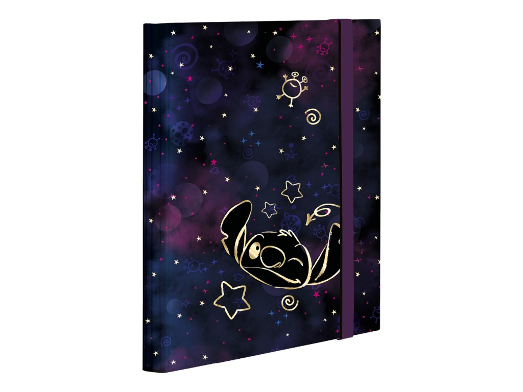 Školní box s plochou gumičkou z kolekce Stitch Gold. Kontrastní barva a tištěný motiv uvnitř desek. Pevné vnitřní klopy s drukem pro delší životnost. Kvalitní a odolné zpracování vhodné na denní přenos školních sešitů a jiných dokumentů.Doplňkové parametry