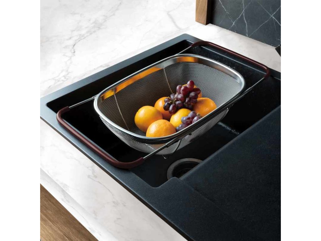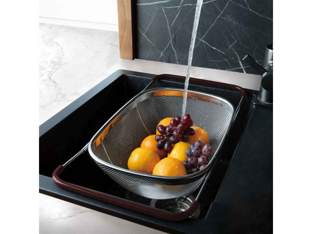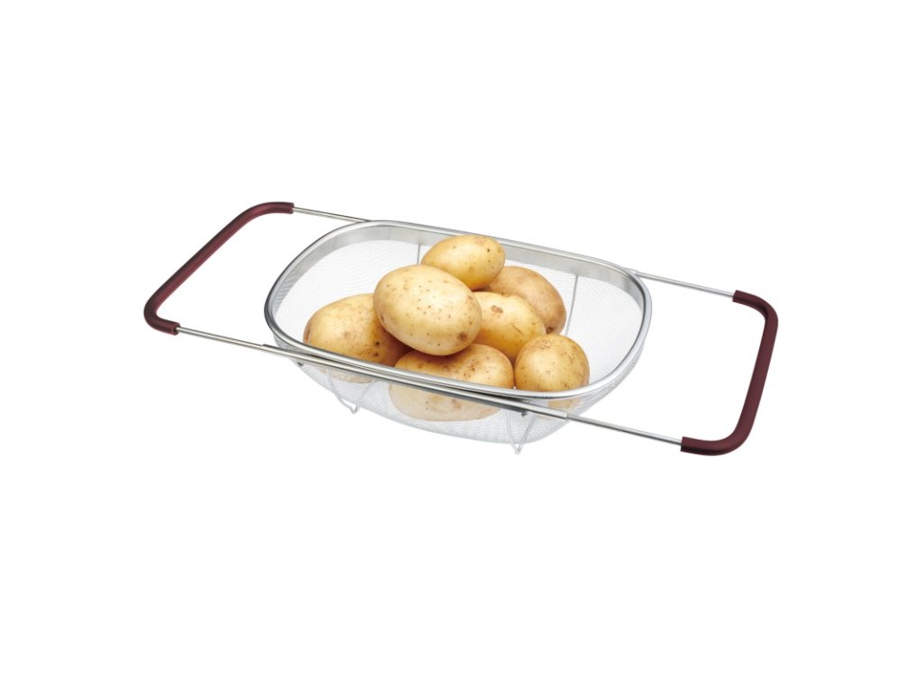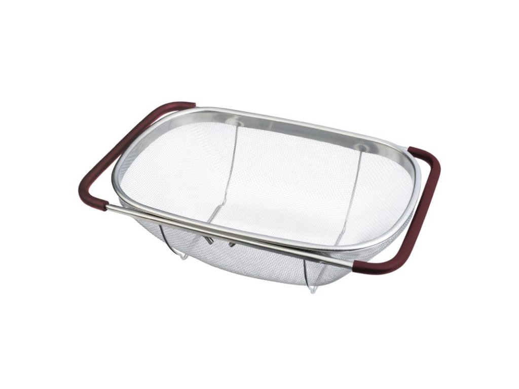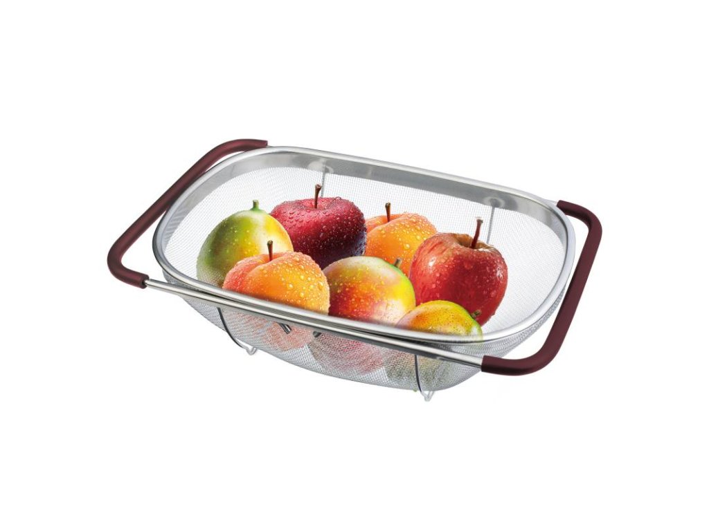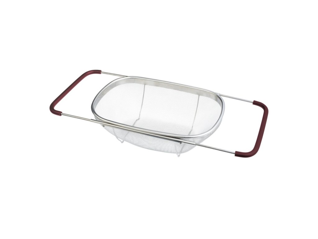Tento flexibilní síťovaný cedník z vysoce kvalitní nerezové oceli 18/10 je ideálním pomocníkem pro každodenní práci v kuchyni. Díky nastavitelným rukojetím v matné bordó barvě jej snadno umístíte na různé typy dřezů, což zajišťuje maximální pohodlí a praktičnost při mytí ovoce, zeleniny nebo cezení těstovin.