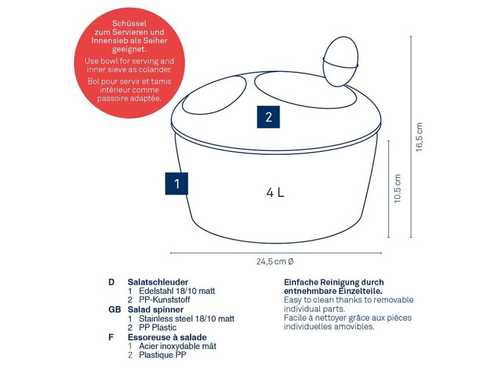 Miska o průměru 24,5 cm je nejen robustní a odolná, ale také všestranná. Můžete jej použít přímo k podávání vašich salátů, zatímco vnitřní sítko slouží jako praktický cedník.