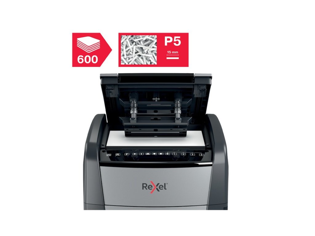Skartovačka Optimum AutoFeed 600M automaticky skartuje až 600 listů papíru A4 (80 g /m2) mikro řezem P-5 (2x15mm). Tento stroj na skartování s automatickým podáváním je sofistikovaný kancelářský skartovač s výsuvným košem o objemu 110L. Není třeba ručně podávat papír nebo nejdříve odstraňovat svorky a kancelářské sponky, tento automatický skartovač papíru udělá vše za vás. DOPORUČENÁ ÚDRŽBA: U AutoFeed skartovaček je pravidelné promazávání řezného mechanismu zásadní pro spolehlivé automatické podávání. Doporučujeme použít olejový list přibližně po každých 2–3 naplněních koše. Pokud jsou řezné bloky vyschlé nebo znečištěné, zvyšuje se jejich odpor a automatický podavač může ztrácet konzistenci podávání – v krajních případech dochází k vtažení více listů najednou nebo k zastavení celé dávky. Pravidelné použití olejových listů udržuje chod plynulý, předchází výpadkům a prodlužuje životnost zařízení.Doplňkové parametry