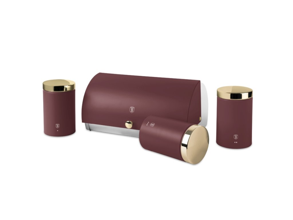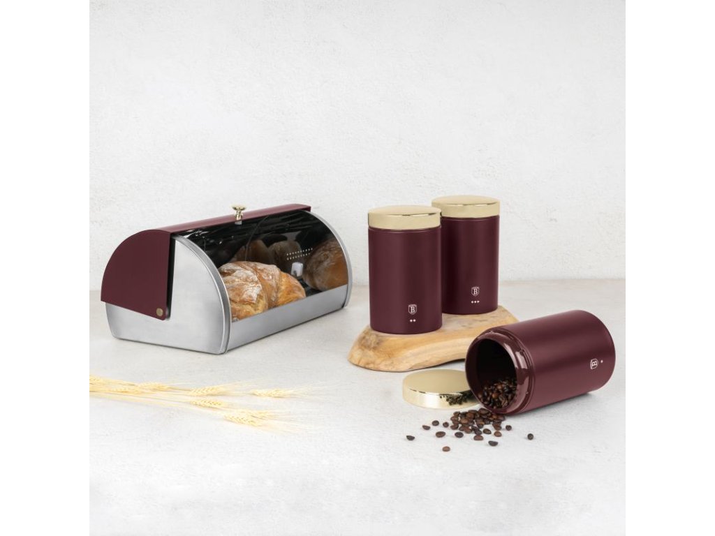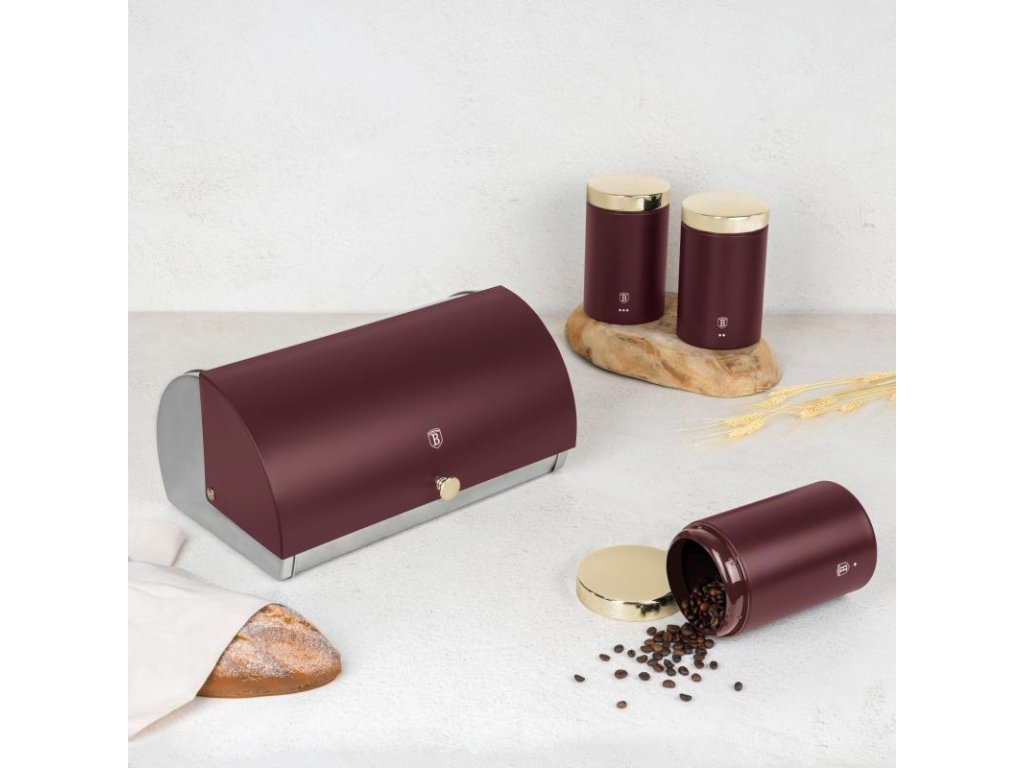 Tento elegantní set chlebníku a tří praktických dóz je ideálním doplňkem pro moderní kuchyň. Vysoká kvalita nerezové oceli, stylová matná bordeaux barva a sofistikovaný design vytvářejí perfektní kombinaci estetiky a praktičnosti. Set obsahuje chlebník, dózu na cukr, dózu na čaj a dózu na kávu – všechny vyrobené z kvalitní nerezové oceli a navržené tak, aby poskytovaly maximální komfort při každodenním používání.