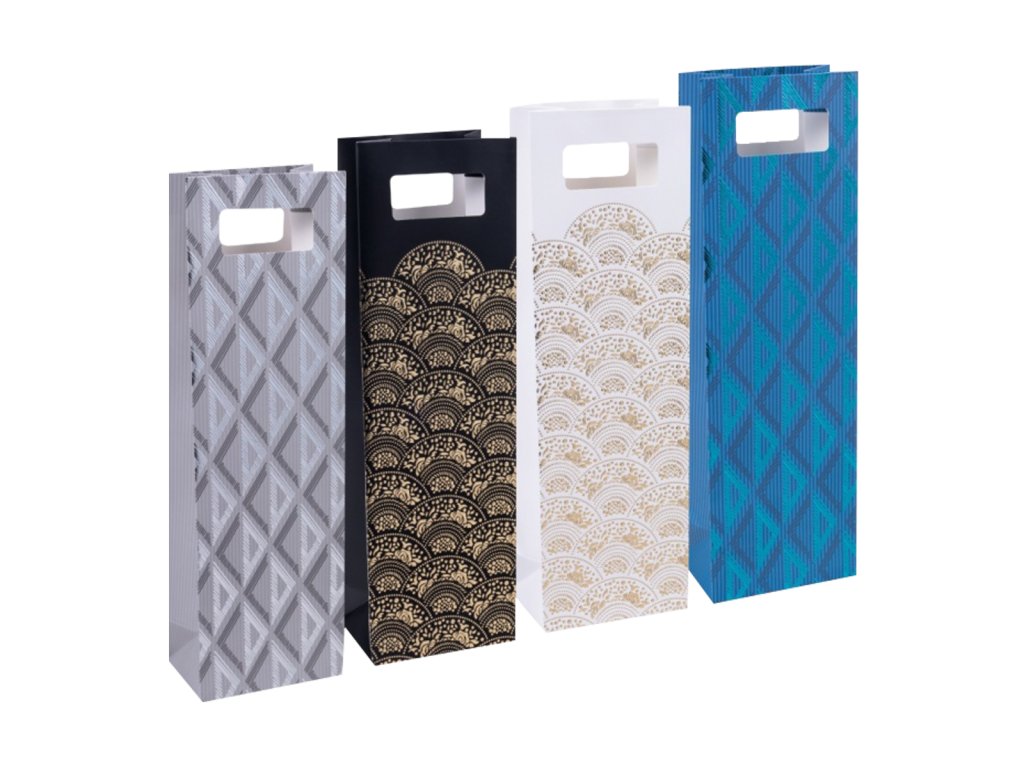 Sada kvalitních dárkových tašek určená pro balení 1 lahve vína či jiného nápoje. Laminovaný matný povrch je odolný proti oděru a poškození, atraktivní barvy a motivy. Zesílené dno, integrovaná rukojeť – výsek pro komfortní držení.Doplňkové parametry