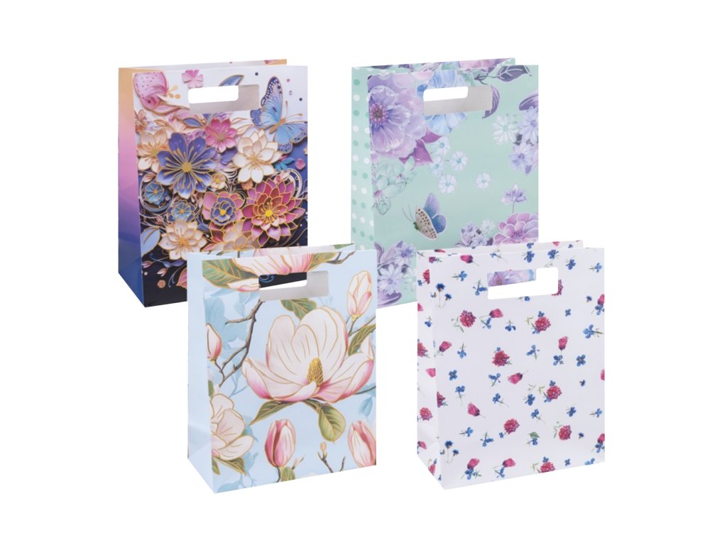 Sada kvalitních dárkových tašek, vhodná na většinu slavnostních příležitostí. Laminovaný lesklý povrch je odolný proti oděru a poškození. Luxusní vzhled. Integrovaná rukojeť – výsek pro komfortní držení. Stylový motiv květin.Doplňkové parametry