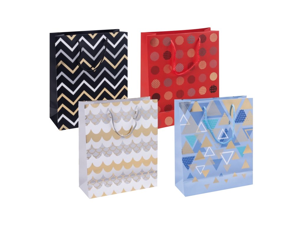Sada kvalitních dárkových tašek, vhodná na většinu slavnostních příležitostí. Laminovaný lesklý povrch je odolný proti oděru a poškození. Atraktivní barvy doplněné o motiv geometrických tvarů. Barevně sladěné pevné šňůrky pro pohodlné přenášení.Doplňkové parametry