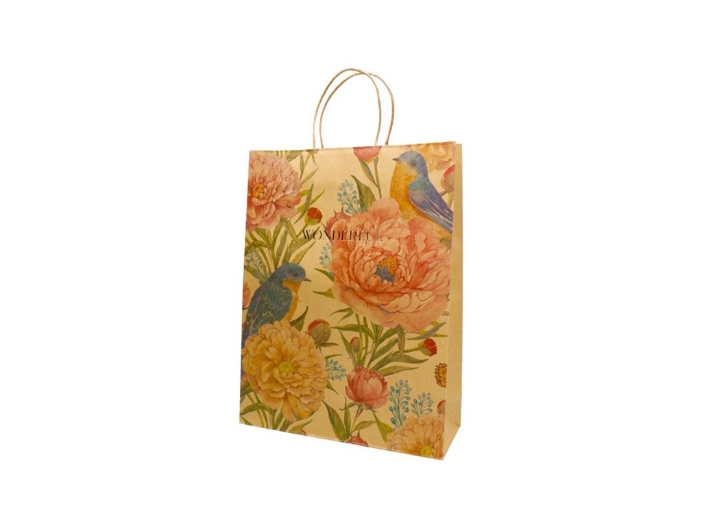 Elegantní papírové dárkové tašky, perfektní pro každou příležitostVyrobeno z vysoce kvalitního craft papíru (gramáž 150 g/m2)Pevná ucha vyrobená z krouceného papíruRozměr: 32,0 x 42,0 cm, hloubka 11 cmMotiv: ptáci a květiny (4 různé motivy)Barva: hnědý papír, mix barevVýběr motivu je náhodnýMinimální objednávka: 12 ksDoplňkové parametry