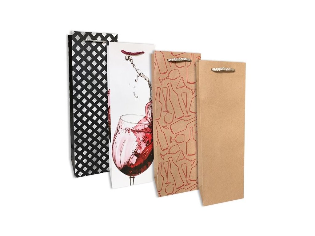 Dárková taška na lahev s textilními uchy, ideální pro většinu standardních lahví vínaVyrobeno z vysoce kvalitního papíru (gramáž 190 g/m2)Rozměry: 10,0 x 33,0 cm, hloubka 8,5 cmMotivy: mix motivů (kosočtverce, sklenka, hnědá s obrysy, hnědá)Barva: mix barevVýběr motivu je náhodnýMinimální objednávka: 12 ksDoplňkové parametry