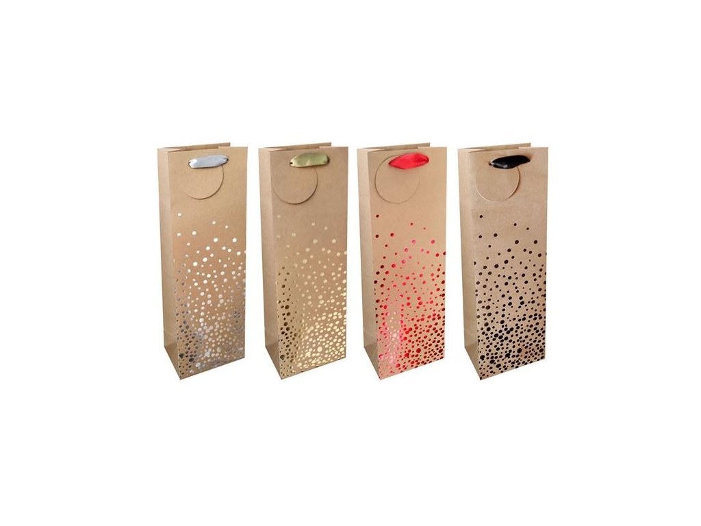 Dárková taška na lahev s textilními uchy, ideální pro většinu standardních lahví vínaVyrobeno z vysoce kvalitního papíru (gramáž 210 g/m2)Rozměry: 12,0 x 36,0 cmMotivy: matně hnědá s různě barevnými puntíkyBarva: mix barev (hnědá se stříbrnou, hnědá se zlatou, hnědá s červenou, hnědá s modrou)Výběr motivu je náhodnýMinimální objednávka: 12 ksDoplňkové parametry