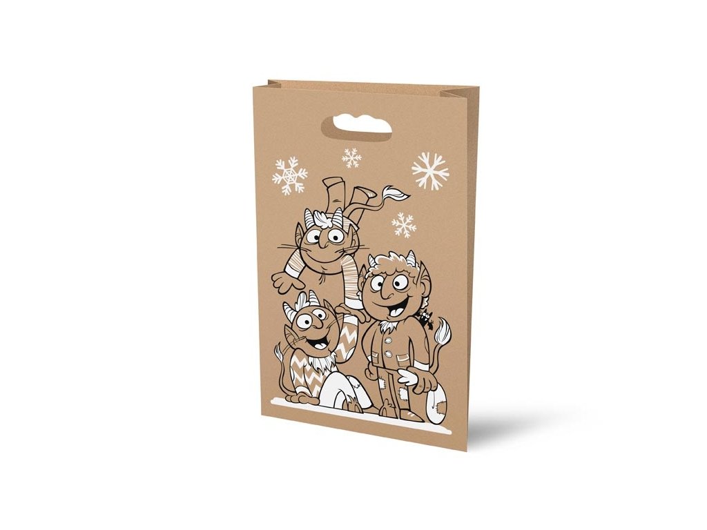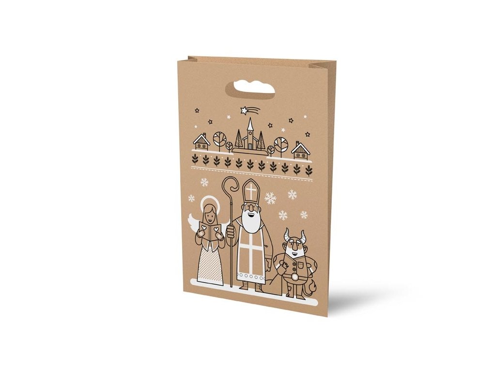 Dárková papírová taška s průhmatem a černobílým potiskem Mikuláše, anděla a čerta. Ideální na vytváření čokoládových balíčků pro děti! Materiál: hnědý papír 85 g ZVOLENÝ MOTIV UVEĎTE DO POZNÁMKY. Negarantujeme dodání Vámi zvoleného motivu.Doplňkové parametry