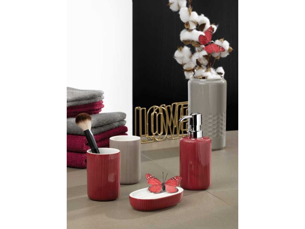 Barva pro vaši koupelnu: velký, krásný keramický dávkovač mýdla Ava o objemu 350 ml. Nápadná je malinová červená barva dávkovače mýdla. Výměnná hlava čerpadla je vyrobena z plastu, pochromovaná. Výška: 17,5 cm Keramika 7,5 cm, v. 19 cmDoplňkové parametry