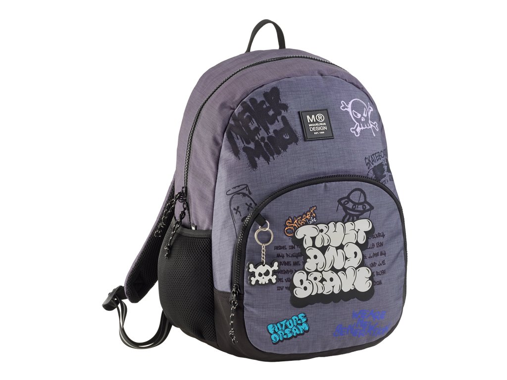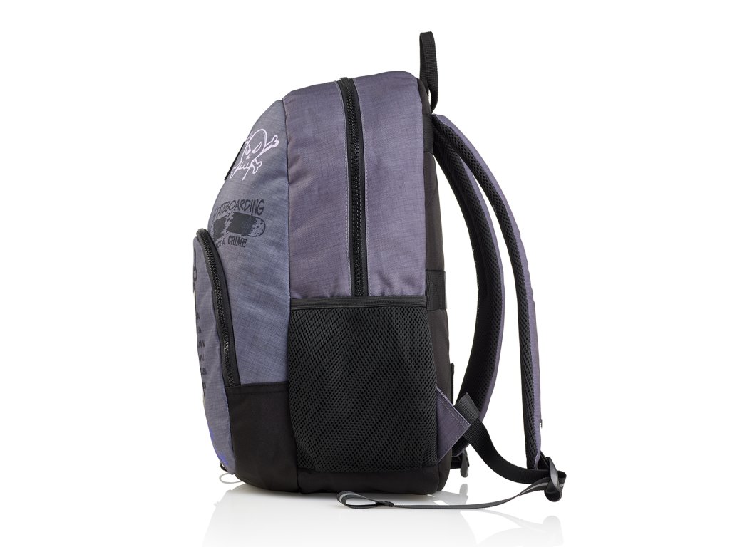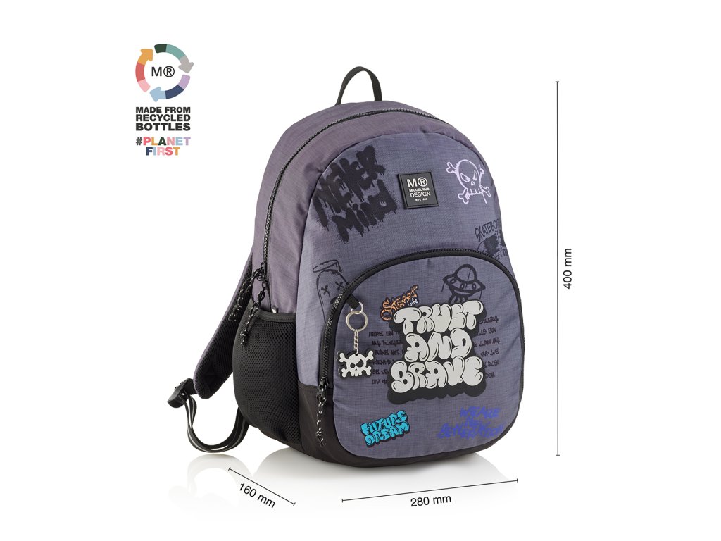 Moderní, lehký batoh s motivy graffiti. Dělení na dvě kapsy a vnitřní organizér poskytuje dostatek prostoru pro školu a osobní drobnosti. Recyklovaný odolný materiál prodlužuje životnost, zesílené výztuhy zespodu chrání batoh před poškozením a znečištěním. Lze připevnit k troleji kufru.Doplňkové parametry