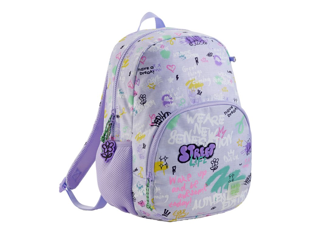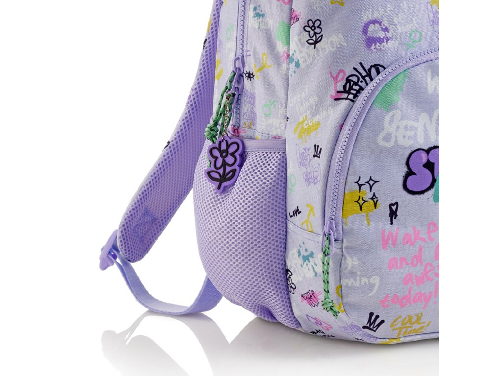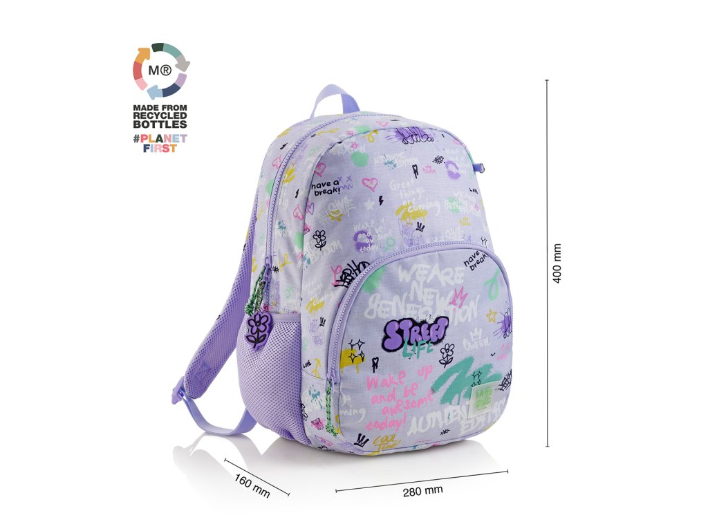 Moderní, lehký batoh s grafitovými motivy. Dělení na dvě kapsy a vnitřní organizér poskytuje dostatek prostoru pro školu a osobní drobnosti. Recyklovaný odolný materiál prodlužuje životnost, zesílené výztuhy zespodu chrání batoh před poškozením a znečištěním. Lze připevnit k troleji kufru.Doplňkové parametry