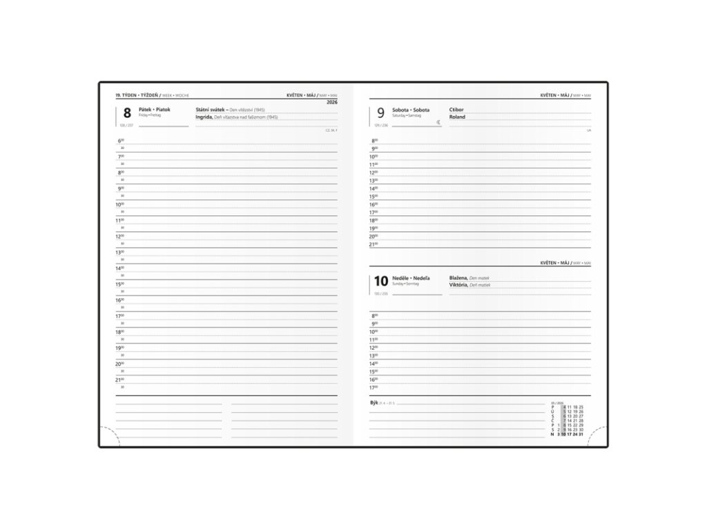 povrch diáře příjemný na dotek, zářivé barvy, moderní design, české a slovenské jmenné kalendárium, dny a měsíce v 5 jazycích (CZ, SK, ANG, D, R), mezinárodní svátky, měsíční fáze, roční období, letní a zimní čas, místo na poznámky, formát 14,3 x 20,5 cmDoplňkové parametry