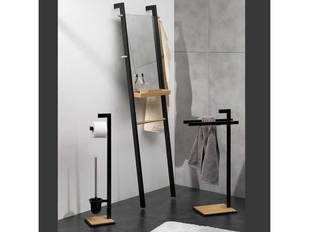Stylový a moderní vzhled: dubový věšák na ručníky vyrobený z kovu. Stojící model získává svůj osobitý vzhled kombinací černého povrchu, plochých tvarů a světle hnědé dubové dřevěné dýhy na základní desce. Držák ručníku má 2 neotočné držáky na ručníky. Základní deska držáku na ručník má rozměry 30 x 24 cm s celkovou výškou 82,5 cm. Kov černý matný s dubovou dřevěnou dýhou 30x24cm 82,5cm vDoplňkové parametry