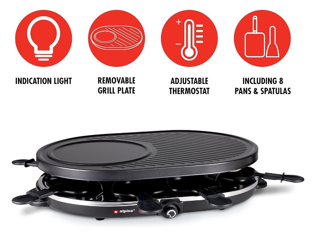 Elektrický gril kombinuje raclette a grilování – jedna polovina elektrického grilu je kamenná deska, druhá grilovací deska a dole se nachází 8 gurmánských pánviček. Na váš vkus – dáváte přednost masu nebo rybám, vegetariánským nebo veganským pokrmům? s gurmánskou kuchyní můžete zcela jednoduše reagovat na přání všech. Elektrický gril na společenské jídlo – jídlo se připravuje a konzumuje u stolu. jako hostitelka nebo hostitelka máte celou dobu na světě na chatování a užívání. Raclete 8 osob – tato Sada, obsahující obsahuje raclette sadu s grilovací deskou a 8 pánvičkami a špachtlemi, takže se u stolu může místo posadit velká skupina. Snadné čištění – grilovací desku lze vyjmout z podstavce, čímž se snáze drží a čistí. samozřejmě byste měli po použití nechat vychladnout.