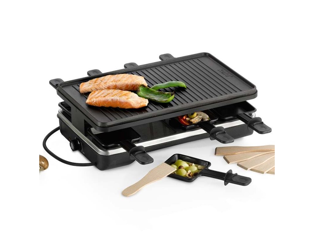 - multifunkční stolní gril kombinující Raclette a velkou grilovací desku v jednom- elektrický gril lze použít prakticky kdekoli, v kuchyni, obýváku, na balkóně, terase i na zahradě- hlavní předností je prostorná litinová grilovací deska- grilovací deska je z jedné strany žebrovaná a z druhé hladká- otočením desky tak získáte dva různé grilovací povrchy- díky dokonalým vlastnostem litinové grilovací desky budete grilovat jako na tradičním venkovním grilu- pootočením knoflíku můžete plynule regulovat výkon a tedy i teplotu grilu- výkonné topné těleso zajistí rychlé rozehřátí desky, ta litinová navíc drží teplotu dlouhou dobu- kompletní balení obsahuje také příslušenství:- 8 x nepřilnavá minipánvička na raclette - 8 x dřevěná špachtle- celkové rozměry grilu: 40 x 24 x 13 cm- vhodné až pro 8 osob- značka: KELADoplňkové parametry