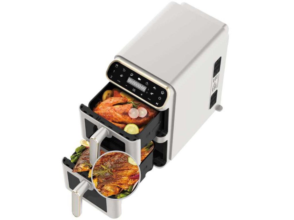 Technické parametry:• Napájení: 220–240 V ~ 50–60 Hz 2460 W• Regulace teploty: 60–200 °C• VELIKOST XXXL: Objem: 11 l = 5,5 l + 5,5 l• Nepřilnavá miska na olej a košík na potraviny – vhodné do myčky nádobí• DIGITÁLNÍ• Barva: matná krémováVlastnosti:• Funkce rychlého ohřevu• Ochrana proti přehřátí• Funkce automatického vypnutí po vyjmutí koše• LED displej s dotykovou obrazovkou• Systém menu vaření s tlačítky pro každý druh jídla (9 druhů)• Viditelná okénka• Časovač až 60 minut• Zdravý způsob vaření bez oleje a tuku• Až o 80 % méně tukuDoplňkové parametry
