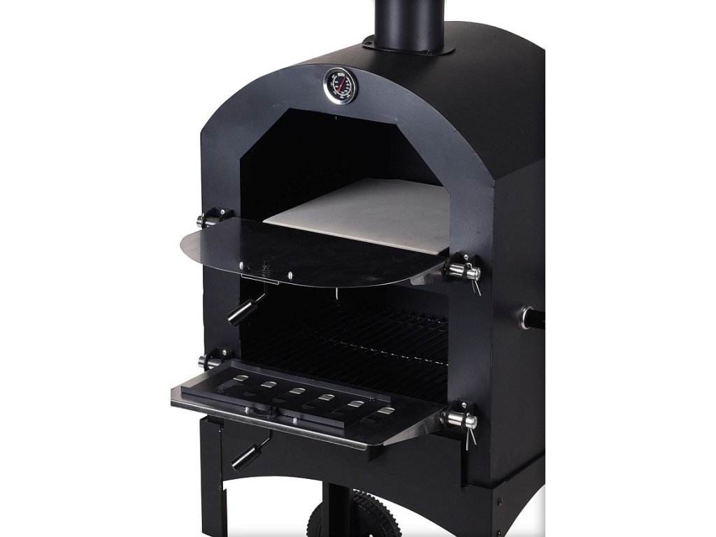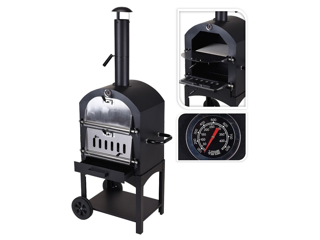 Multifunkční zahradní gril se širokými možnostmi využití se ihned stane chloubou Vaší zahrady nebo terasy. Na tomto grilu / peci zvládnete všechny tyto způsoby přípravy: klasické grilování na roštu, pečení pizzy nebo chleba na kamenné desce, uzení studeným i teplým kouřem, vaření i ohřívání. Šamotový pizza kámen pro pečení lze snadno zaměnit za klasický grilovací rošt, na kterém můžete připravovat masové speciality i ryby. Samostatně přístupné ohniště má vlastní dvířka a umožní snadné přikládání. Důmyslně řešený systém klapek má společně s komínem na svědomí regulaci teploty, kterou můžete jejich nastavením přímo ovlivnit a regulovat. Pec můžete díky velkým pojezdovým kolům a postranní rukojeti snadno přemisťovat. Velká odkládací police pod grilem je skvělý prostor pro uložení dřevěného uhlí, náčiní nebo špalků dřeva, což zároveň skvěle vypadá.- silná ocelová konstrukce s tloušťkou stěny 1,2 mm- tradiční, klenutý tvar pece, díky kterému docílíte opravdu dokonalých výsledků pečení- široká škála využití- přizpůsobené také k uzení studeným i teplým kouřem- použití jako velká grilovací plocha nebo pizza kámen- vestavěný teploměr pro kontrolu vnitřní teploty- odtahový komín se stříškou a regulovatelná ventilace- dvě pojezdová kolečka a postranní rukojeť pro snadnou manipulaci- snadno přístupná vyjímatelná přihrádka na popel Vám usnadní čištění pece- velká odkládací plocha pod grilem, aby bylo vše potřebné vždy po ruceTECHNICKÉ PARAMETRY:- konstrukce: ocelová- teploměr: ano- regulace teploty: ano- otočná kola: ano, 2- úložný prostor: ano- obslouží počet osob: až 12- rozměry grilovacího roštu: 45 x 30 cm- výška grilovacího roštu: nastavitelná 54 až 76 cm- celkové rozměry: 50 x 38 x výška 150 cm- hmotnost: 28 kg- zdroj: dřevo, uhlí, brikety- značka: Vaggan NetherlandsDoplňkové parametry