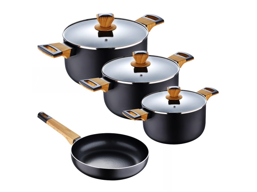 •7dílná kuchyňská sada: 1 pánev 24 cm, 1 pánev 16 cm s poklicí, 1 hrnec s poklicí 20 cm, 1 hrnec s poklicí 24 cm.•Vyrobeno z rychle se zahřívajícího lisovaného hliníku.•Nepřilnavý povrch ILAG Premium v černé barvě.•Bodová indukční základna, vhodná do všech typů kuchyní.•Žáruvzdorná dřevěná rukojeť s měkkým dotykem.•Doporučeno ruční mytí.Doplňte svou kuchyni tímto nádobím skládajícím se z 1 24 cm pánve, 1 16 cm hrnce s poklicí, 1 20 cm hrnce s poklicí a 1 24 cm hrnce s poklicí, různých velikostí, aby vyhovovaly všem vašim potřebám. Kolekce je vyrobena z lisovaného hliníku pro rychlou distribuci tepla a nepřilnavý povlak ILAG Premium je velmi odolný povlak vhodný pro každodenní použití díky dobré odolnosti proti poškrábání a oděru. Tyto materiály umožňují použití minima tuku v pánvích a pánvích bez obsahu PFOA, olova a kadmia, což je ideální pro zdravé vaření. Ergonomické, na dotek měkké, žáruvzdorné dřevěné rukojeti zabraňující popálení. Indukční základna Dot je vhodná pro všechny zdroje tepla jako je indukce, plyn, sklokeramika, halogen a elektřina. Snadno se čistí, potraviny se nelepí na povrch a pro prodloužení životnosti výrobku se doporučuje ruční mytí.Doplňkové parametry