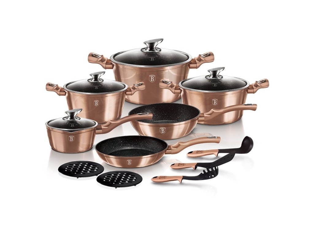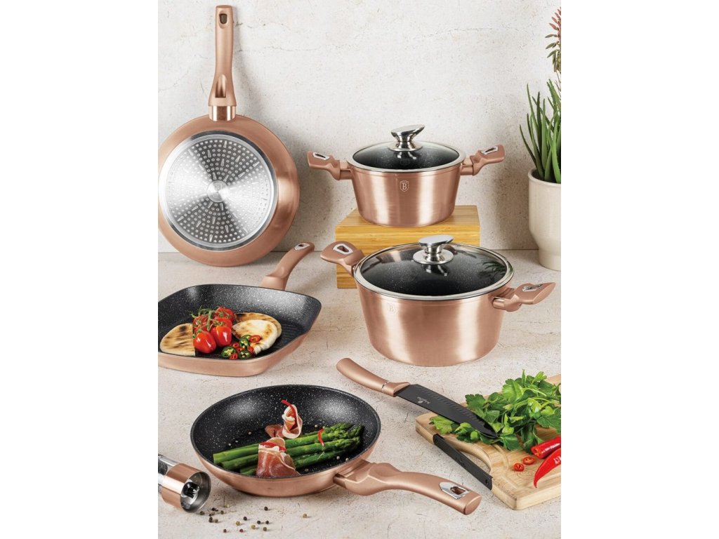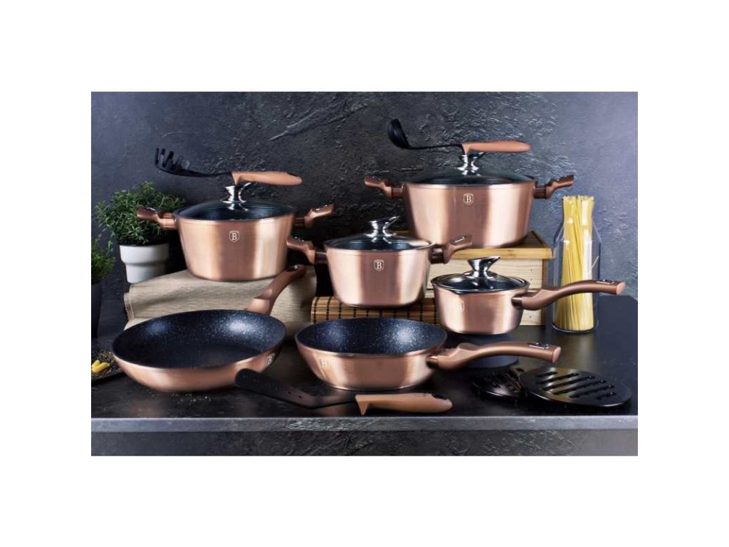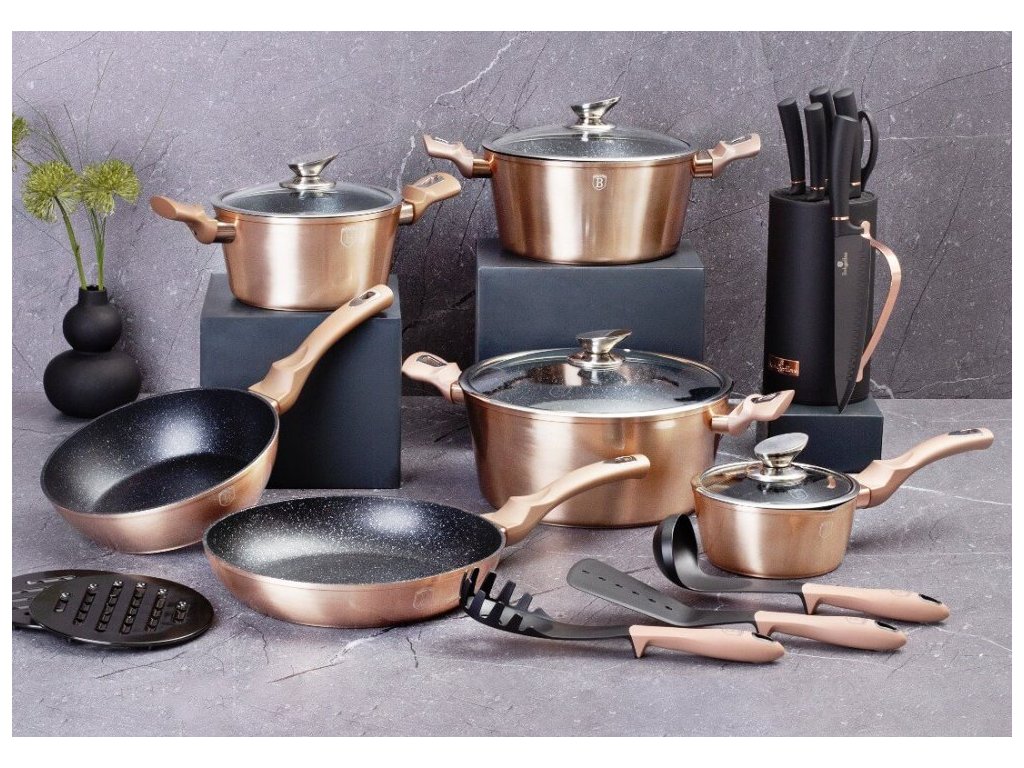 Hledáte vhodnou sadu nádobí do vaší kuchyně? Sadou získáte všechny potřebné nádoby na vaření, ať už budete vařit pro sebe nebo pro více osob. Velkou výhodou je, že můžete objednat najednou více nádobí od ověřeného výrobce BERLINGERHAUS. Sadu nádobí sjednocuje jednotný design, navíc měď barva celé sady je univerzální a vyjímat se bude v každé kuchyni.