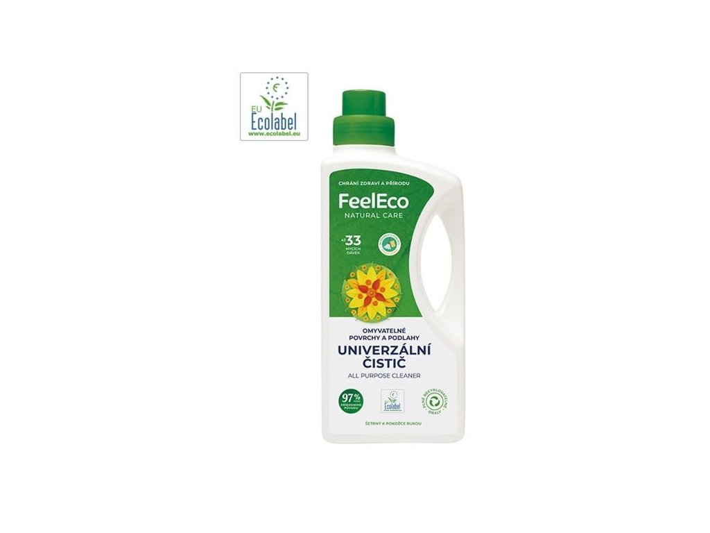 Ekologický a vysoce účinný univerzální čisticí prostředek Feel Eco s jemnou citronovou vůní vhodný pro čištění všech typů povrchůJe složen výhradně ze snadno biologicky odbouratelných a netoxických surovin, které jsou v maximální míře šetrné k životnímu prostředíDíky obsahu aktivních látek účinně odstraňuje špínu a mastnotu z podlah, obkladů, dlaždic, povrchů z umělých hmot apod.Vegan - produkt není testován na zvířatech a složení neobsahuje žádné látky živočišného původu 100% recyklovatelný obalObjem: 1,0 lMnožství v originálním balení 8 ksCertifikát EcolabelDoplňkové parametry