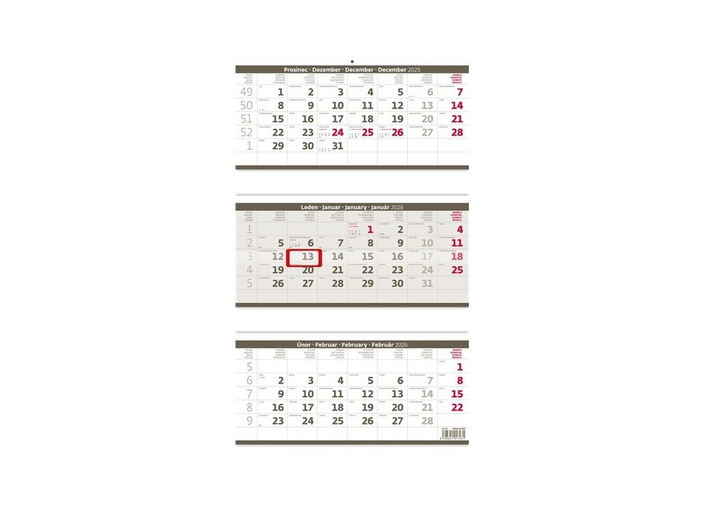 Rozměr: 31,5 x 55,5 cm3 x 12 listůČeské třímesíční jmenné kalendárium se svátky vybraných evropských států(CZ / SK / A / B / D / F / H / CH / I / PL / RUS / UKR)ZAKÁZKOVÁ VÝROBA OD 50 KS: V případě Vašeho zájmu o zboží s potiskem nebo ražbou kontaktujte Vašeho obchodního zástupce nebo můžete zaslat svou poptávku na email: printcz@officeo.czDoplňkové parametry