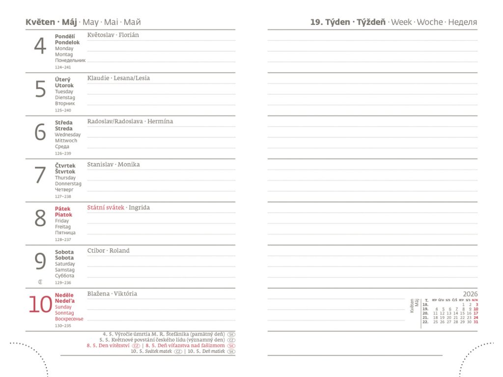 desky z na dotek příjemné matné koženky, desky jsou tenké a díky tomu je celý diář lehký a ohebný, doplněný o poutko na tužku a gumičku v jiné barvě, mezinárodní svátky, plánovací kalendář, osobní údaje, měsíční přehled, adresář, mapa Evropy a České a Slovenské republiky, formát 14,5 x 20 cmDoplňkové parametry