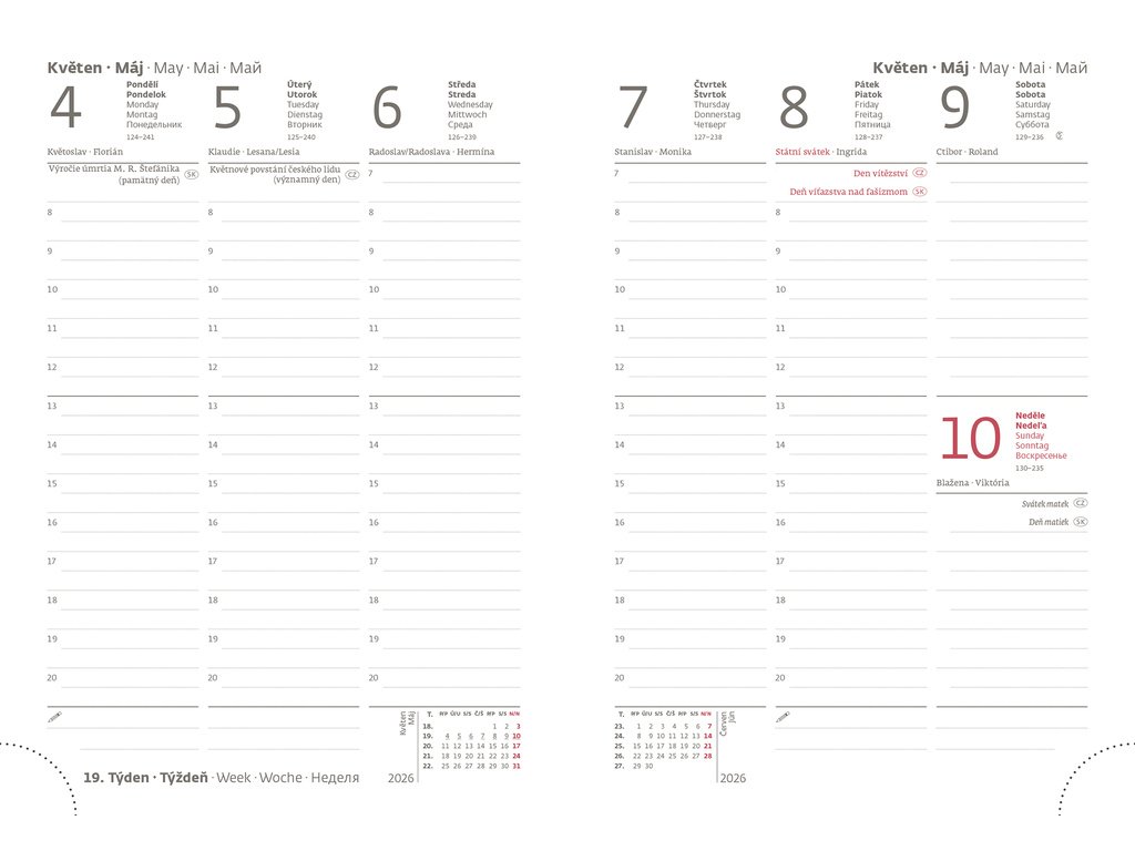desky příjemné na dotek, speciální lamino se zajímavými designy, diář doplněný gumičkou, osobní údaje, měsíční přehled, státní svátky, mezinárodní svátky, adresář, mapa, formát 12 x 16,5 cmDoplňkové parametry