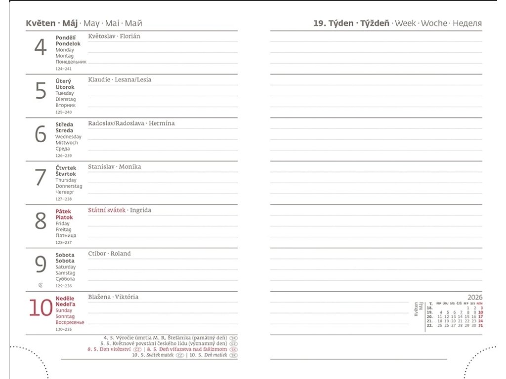 desky příjemné na dotek, speciální lamino se zajímavými designy, diář doplněný gumičkou, osobní údaje, měsíční přehled, státní svátky, mezinárodní svátky, adresář, formát 9 x 14 cmDoplňkové parametry