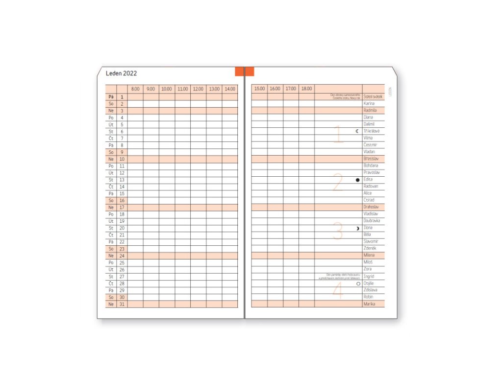 Měsíční diář je umístěn v samostatných deskách spolu s A-Z adresářem A6, díky čemuž jej lze používat i samostatně. Rok je dělen na měsíce, dny a hodiny a každý měsíc je zobrazen na jedné dvoustraně. Tento formulář slouží především pro aktivity a termíny ve vzdálenější budoucnosti než jeden týden. Sešítek se 13ti listy, na boční straně listů záložky s názvy měsíců pro snadnější orientaci, rozměry: 15,5 x 8,5 cm.Doplňkové parametry
