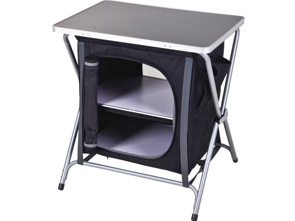 Díky této skládací kuchyňské lince můžete v kempu vařit v naprostém pohodlí. Pracovní deska nabízí prostor pro kompletní přípravu jídla. Pod pracovní deskou jsou 2 přihrádky, kam můžete přehledně uložit jídlo, nádobí a další kuchyňské náčiní. Tento kuchyňský nábytek lze složit, takže jej lze vždy skladovat a snadno vzít s sebou do auta.- přenosná kempingová skříňka / kuchyně- hliníková konstrukce s pracovní deskou- plášť z polyesteru 600D- velmi dobře odolný proti protržení a prodření- transportní obal s rukojeťmi- rozměry: 60 x 45 x 64 cm- celková váha: 5 kg- barva: černá- značka: PROGardenDoplňkové parametry