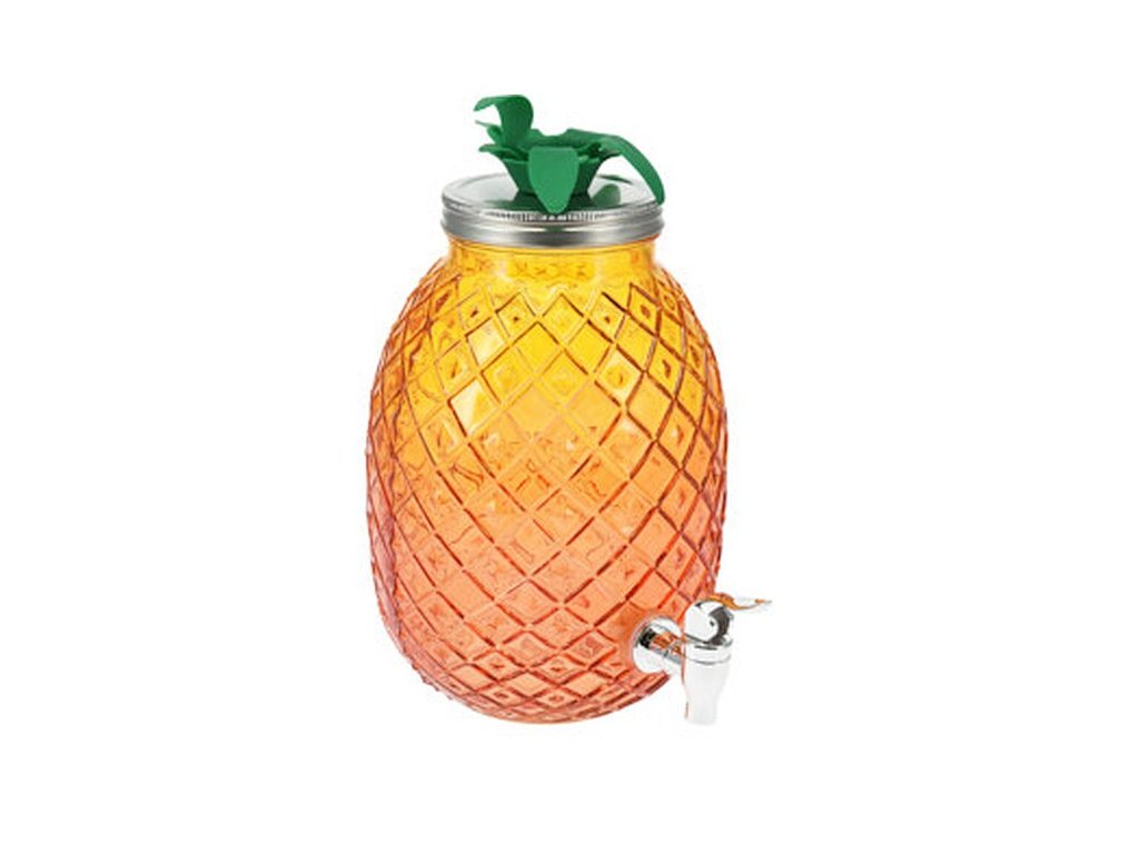 Barevné provedení (žlutá/oranžová) rozzáří každý interiér i venkovní posezení, zatímco stříbrný kohout z PP plastu umožňuje pohodlné nalévání bez rozlití. Kovové víčko zajišťuje uzavření a chrání obsah před vnějšími vlivy, zatímco zelený silikonový list nebo korunka na víčku přidává dávkovači hravý dotek přírody.