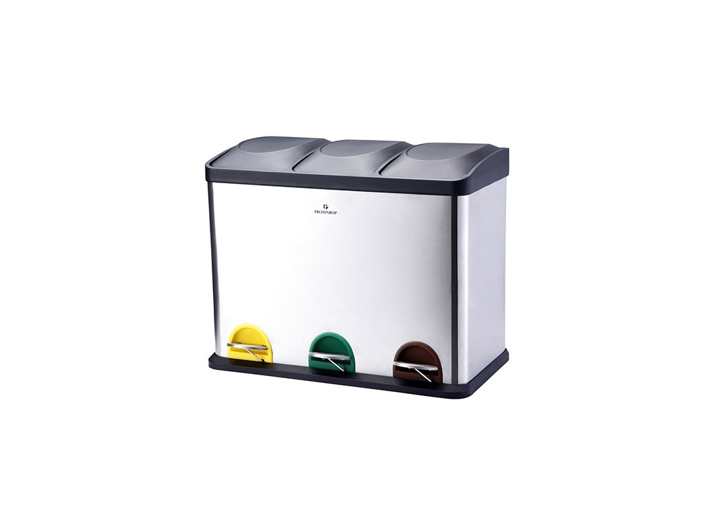- materiál: nerezová ocel- barva: stříbrná/černá- leštěný povrch- pedálové otevírání- 3 nádoby na třídění odpadu (3x15l)- rozměry: 61,5 x 34,5 x 49 cmDoplňkové parametry
