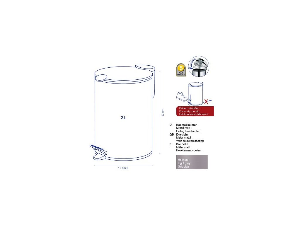 - volně stojící kosmetický koš z oceli- má vyjímatelnou vnitřní nádobu, díky které se snadno udržuje- jistě oceníte SoftClose tiché a plynulé zavírání víka- protiskluzová úprava dna zajistí stabilitu koše- matný vnější povrch- pedálové i ruční otevírání víka- objem 3 litry- rozměry: výška 23 cm, průměr 17 cm- barva: béžováDoplňkové parametry