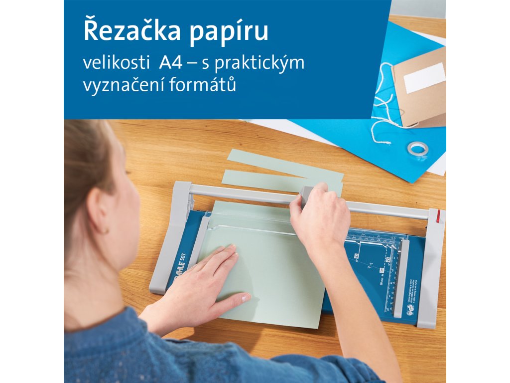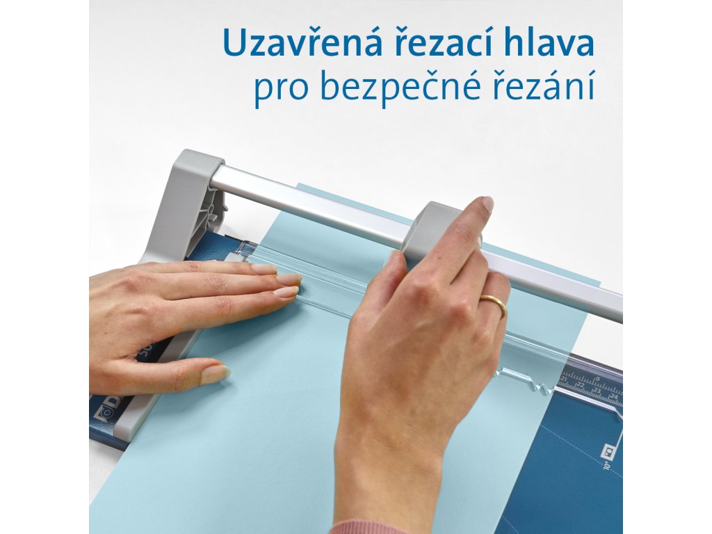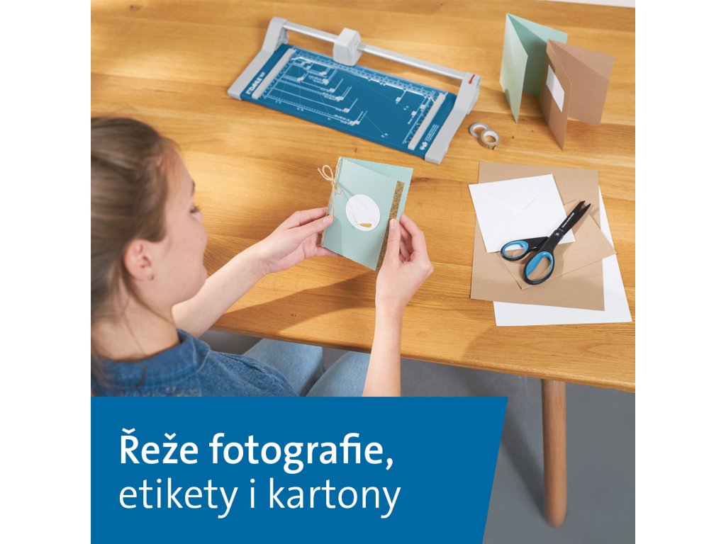 Bezpečná kotoučová řezačka pro běžné použití v kanceláři i škole. Ostrý kotoučový nůž a spodní nůž zaručují přesný řez. Uzavřená hlava nože s vylepšenou ergonomií těla zajišťuje vysokou míru bezpečnosti. Snadná výměna řezací hlavy. Stabilní kovový stůl s protiskluzovými podložkami. Nová přítlačná lišta s trojúhelníkovým profilem a ukazatelem formátů pro ještě přesnější řezání. Natištěné úhly a DIN formáty - užitečné formátování na stole s dělením v mm, usnadňují přesné vyrovnání řezaného materiálu. Dva příložníky v mm pro přesný řez 90°. Automatický přítlak v místě řezu pro optimální fixaci řezaného materiálu. Lze dokoupit: sada kreativních nožů (980) se 3 hlavami pro dekorační řezy - vlnitý, perforace a skládání, náhradní řezací hlava.- DIN: A4, délka řezu: 320 mm