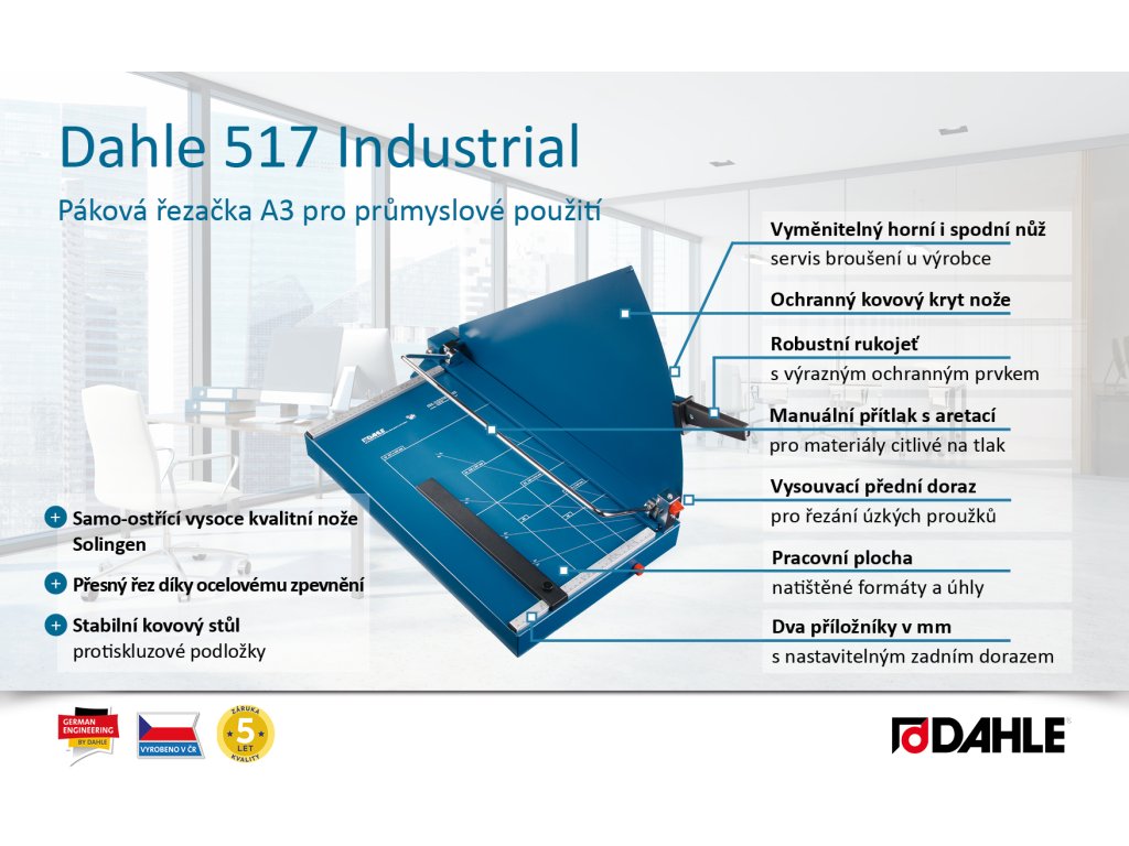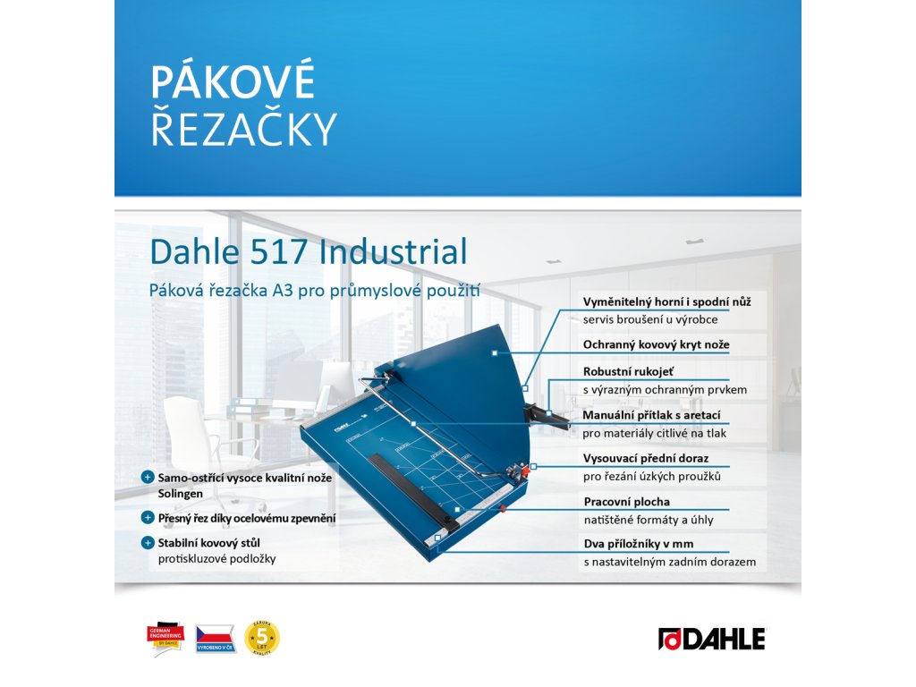 Vysoce kvalitní řezačka pro průmyslové a komerční použití. Samo-ostřící vysoce kvalitní nože Solingen pro stálou kvalitu řezu. Stabilní hřbet nože z plné ocele pro optimální vedení našroubovaného horního nože. Šroubovaný dolní nůž z nerezové oceli Solinger, broušený a kalený. Ocelové zpevnění hřbetu nože zaručuje stabilitu a přesnost řezu. Na celoocelovém hřbetu nože šroubovaný horní nůž z nerezové oceli Solinger, broušený a kalený – s možností dobrušování. Robustní úchop s tvarovanou ochranou prstů. Stabilní kovový stůl s neklouzavými pryžovými podložkami pro komfortní provoz. Robustní rukojeť s výrazným ochranným prvkem. Ochranný kovový kryt nože pro bezpečnost při řezání. Natištěné úhly a DIN formáty usnadňují přesné vyrovnání řezaného materiálu. Příložníky s dělením v mm a nastavitelným zadním dorazem se šroubovým upevněním k rychlému formátování, použitelný na obou úhlových příložnících. Aretovatelné přítlačné rameno pro optimální zafixování řezaného materiálu. Manuální přítlak s aretací pro materiály citlivé na tlak. Vyrobeno v ČR.Doplňkové parametry