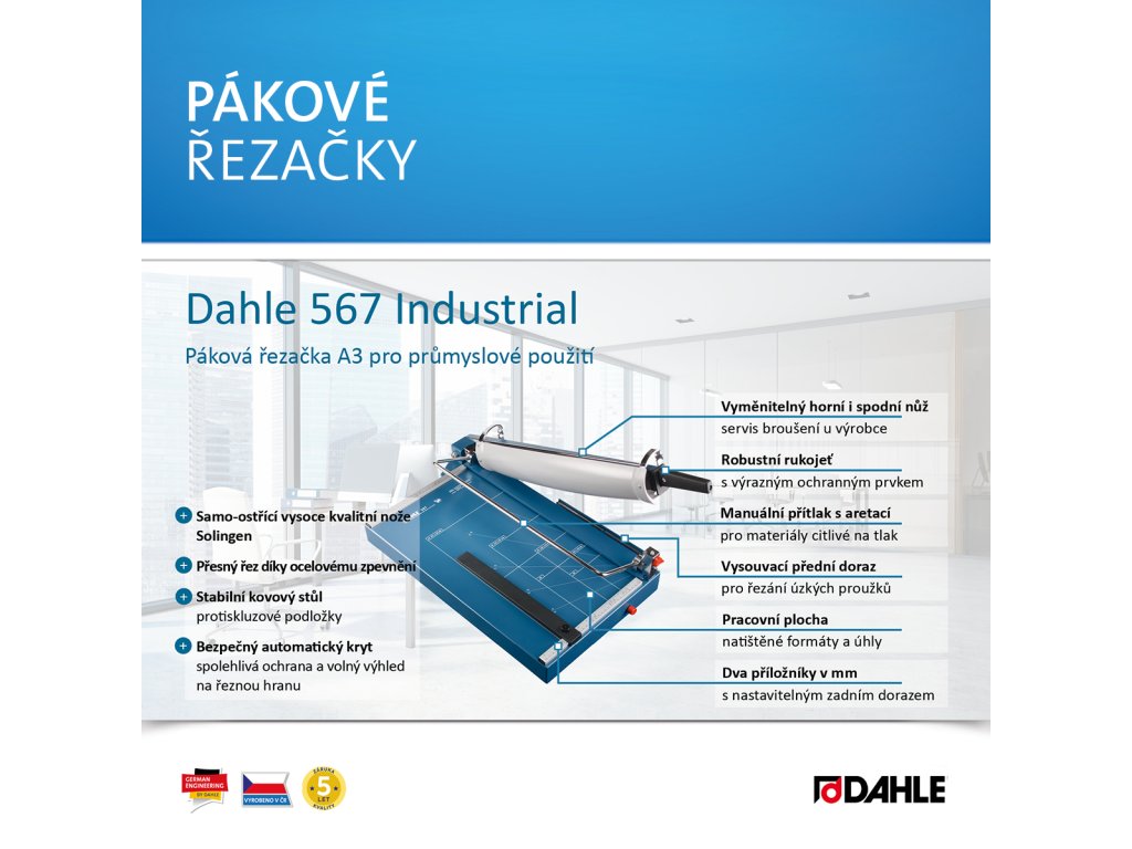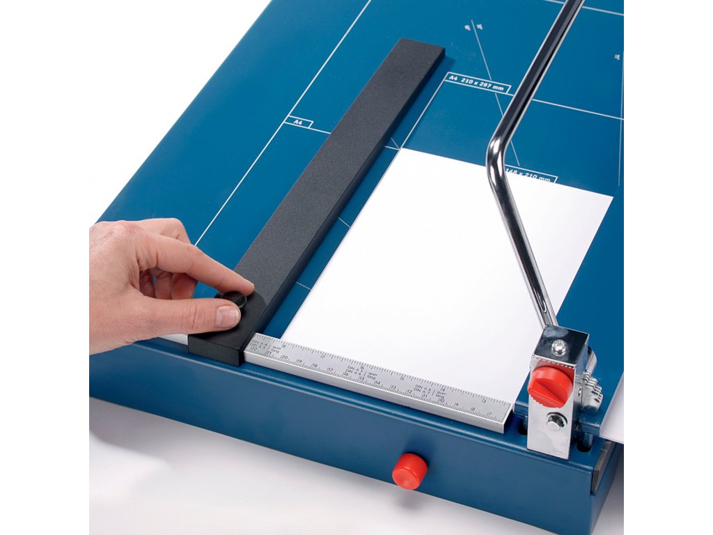 Vysoce kvalitní řezačka pro průmyslové použití. Samo-ostřící vysoce kvalitní nože Solingen pro stálou kvalitu řezu. Ocelové zpevnění hřbetu nože zaručuje stabilitu a přesnost řezu. Vyměnitelný, brousitelný horní i spodní nůž. Stabilní kovový stůl s neklouzavými pryžovými podložkami pro komfortní provoz. Robustní rukojeť s výrazným ochranným prvkem. Vysouvací přední doraz do 210 mm pro řezání úzkých proužků. Bezpečný automatický kryt poskytuje spolehlivou ochranu a volný výhled na řeznou hranu. Natištěné úhly a DIN formáty usnadňují přesné vyrovnání řezaného materiálu. Dva příložníky s dělením v mm a nastavitelným zadním dorazem pro fixaci řezaného materiálu a přesný řez 90°. Manuální přítlak s aretací pro materiály citlivé na tlak. Vyrobeno v ČR.Doplňkové parametry