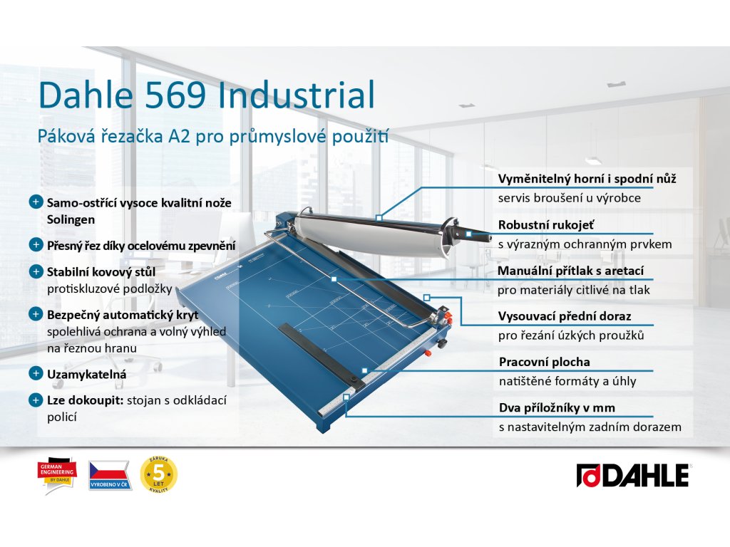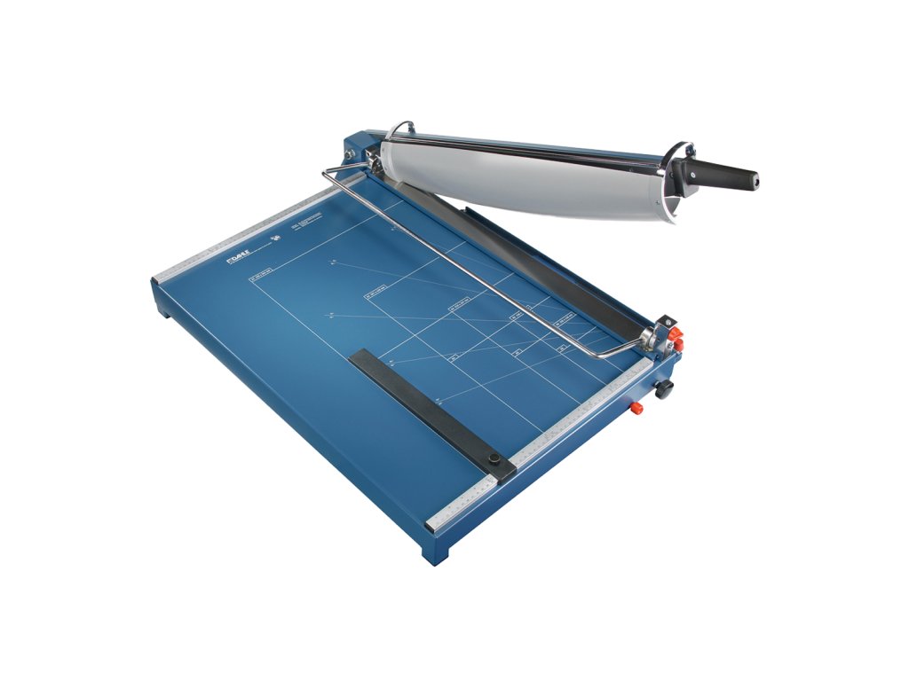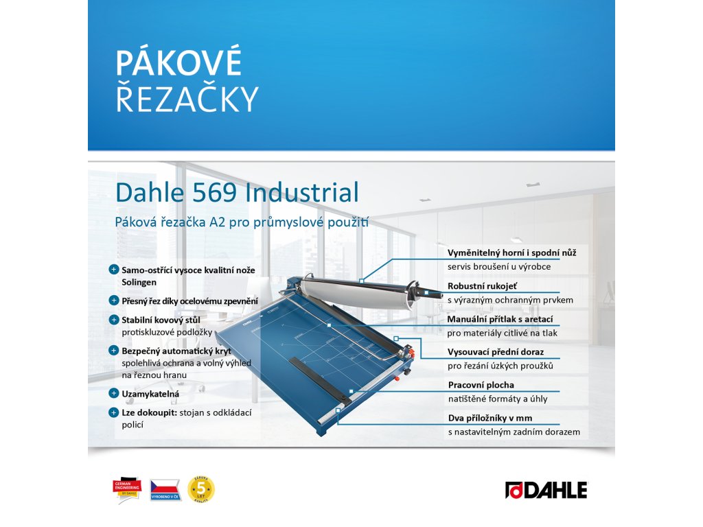 Vysoce kvalitní řezačka pro průmyslové použití. Samo-ostřící vysoce kvalitní nože Solingen pro stálou kvalitu řezu. Ocelové zpevnění hřbetu nože zaručuje stabilitu a přesnost řezu. Vyměnitelný, brousitelný horní i spodní nůž. Stabilní kovový stůl s neklouzavými pryžovými podložkami pro komfortní provoz. Robustní rukojeť s výrazným ochranným prvkem. Vysouvací přední doraz do 210 mm pro řezání úzkých proužků. Bezpečný automatický kryt poskytuje spolehlivou ochranu a volný výhled na řeznou hranu. Natištěné úhly a DIN formáty usnadňují přesné vyrovnání řezaného materiálu. Dva příložníky s dělením v mm a nastavitelným zadním dorazem pro fixaci řezaného materiálu a přesný řez 90°. Manuální přítlak s aretací pro materiály citlivé na tlak. Uzamykatelná proti neoprávněnému používání. Lze dokoupit: praktický stojan s odkládací policí (619) s optimální pracovní výškou 74 cm. Vyrobeno v ČR.Doplňkové parametry