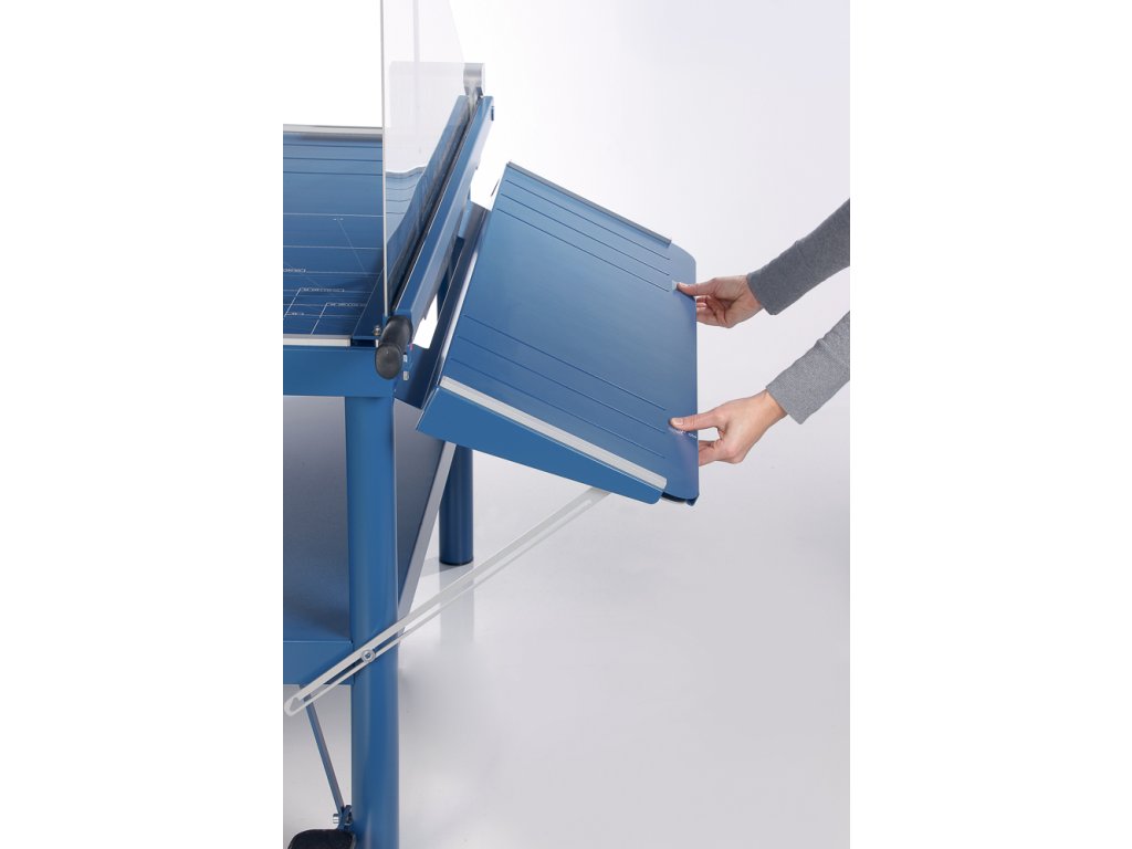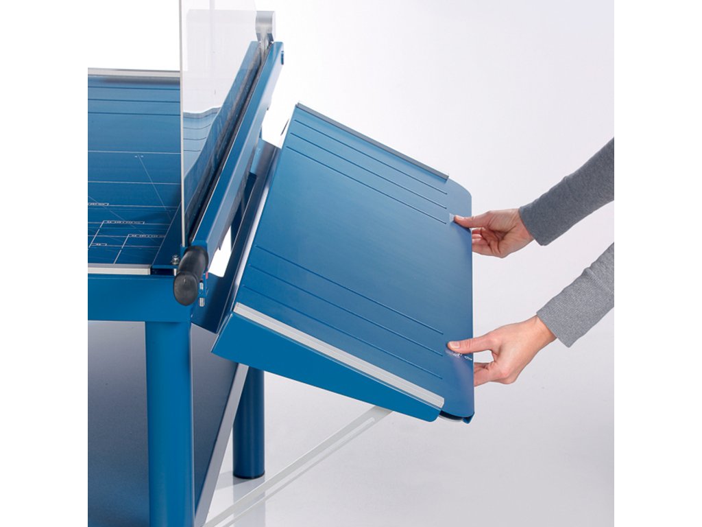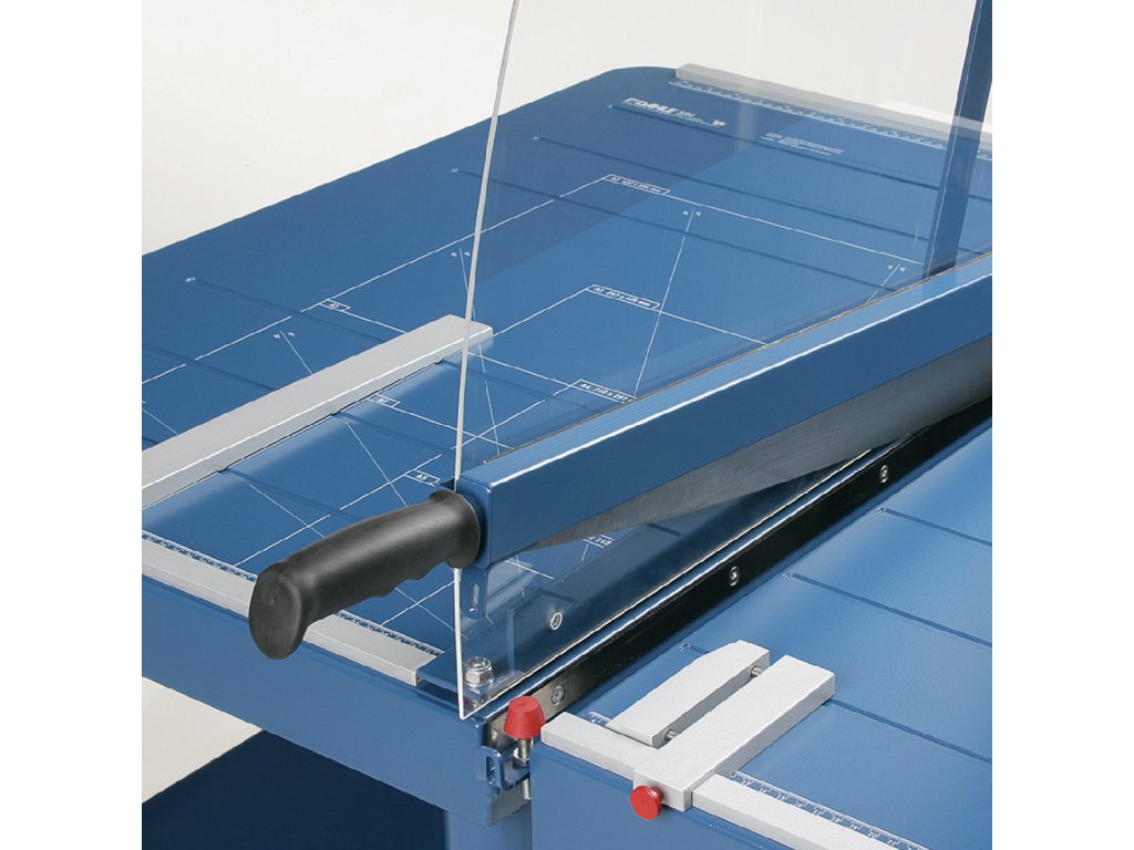 Profesionální ateliérová řezačka. Samo-ostřící vysoce kvalitní nože Solingen pro stálou kvalitu řezu. Speciální nůž vhodný pro širokou škálu materiálů – plsť, látky, kůže, dřevěná dýha apod. Ostří nože má odlišný výbrus a není vhodné na řezání papíru. Ocelové zpevnění hřbetu nože zaručuje stabilitu a přesnost řezu. Vyměnitelný, brousitelný horní i spodní nůž. Stabilní kovový stůl s odkládací policí a zaoblenými rohy pro komfortní provoz. Sklopný přední stůl s nastavitelným předním dorazem. Průhledný ochranný kryt nože pro bezpečnost při řezání. Natištěné úhly a DIN formáty usnadňují přesné vyrovnání řezaného materiálu. Dva příložníky s dělením v mm a nastavitelným zadním dorazem pro fixaci řezaného materiálu a přesný řez 90°. Praktický přítlak nohou. Uzamykatelná proti neoprávněnému používání. Pevně spojený stojan s odkládací plochou pro optimální pracovní výšku 74 cm. Lze dokoupit: přesné zařízení k řezání úzkých proužků (793), přesné naznačení řezu laserovým paprskem (797).Doplňkové parametry