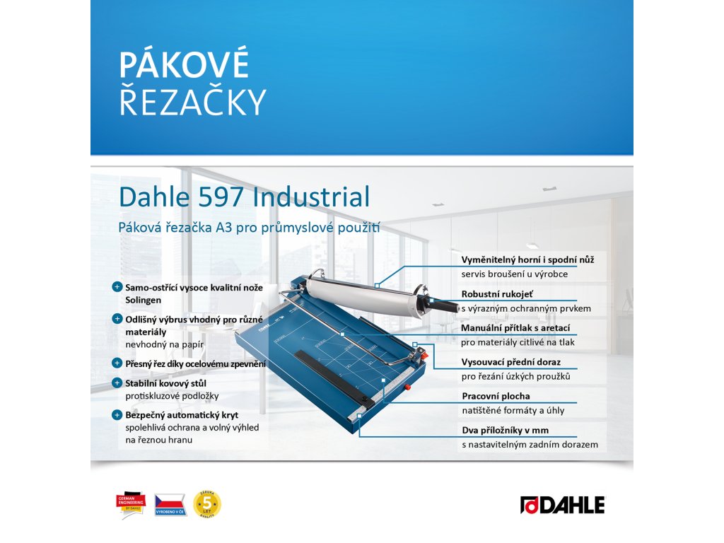 Vysoce kvalitní řezačka pro průmyslové použití. Samo-ostřící vysoce kvalitní nože Solingen pro stálou kvalitu řezu. Speciální nůž vhodný pro širokou škálu materiálů – plsť, látky, kůže, dřevěná dýha apod. Ostří nože má odlišný výbrus a není vhodné na řezání papíru. Ocelové zpevnění hřbetu nože zaručuje stabilitu a přesnost řezu. Vyměnitelný, brousitelný horní i spodní nůž. Stabilní kovový stůl s neklouzavými pryžovými podložkami pro komfortní provoz. Robustní rukojeť s výrazným ochranným prvkem. Vysouvací přední doraz do 210 mm pro řezání úzkých proužků. Bezpečný automatický kryt poskytuje spolehlivou ochranu a volný výhled na řeznou hranu. Natištěné úhly a DIN formáty usnadňují přesné vyrovnání řezaného materiálu. Dva příložníky s dělením v mm a nastavitelným zadním dorazem pro fixaci řezaného materiálu a přesný řez 90°. Manuální přítlak s aretací pro materiály citlivé na tlak. Vyrobeno v ČR.Doplňkové parametry