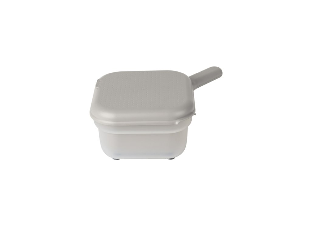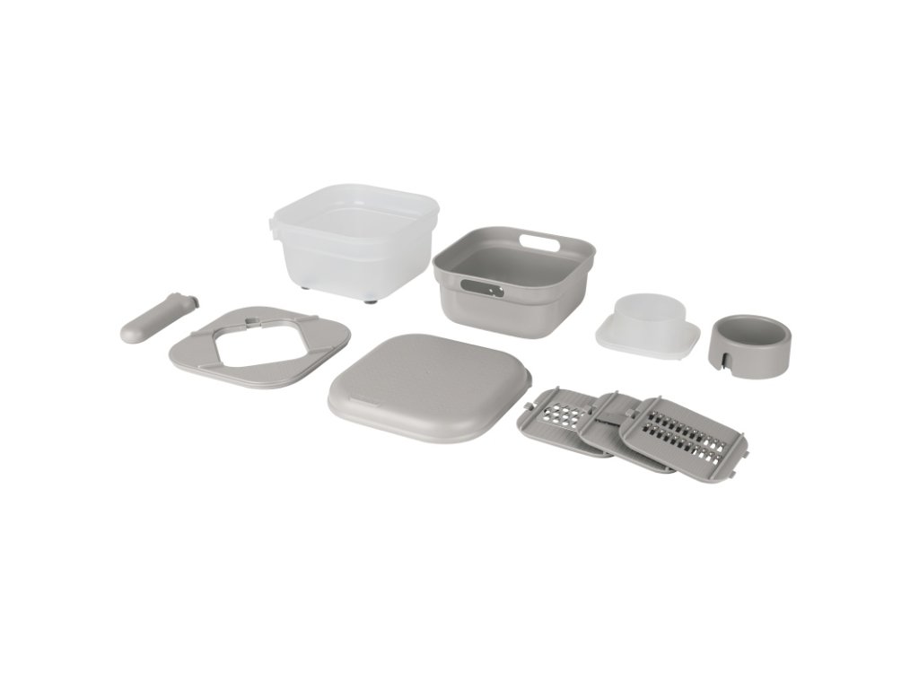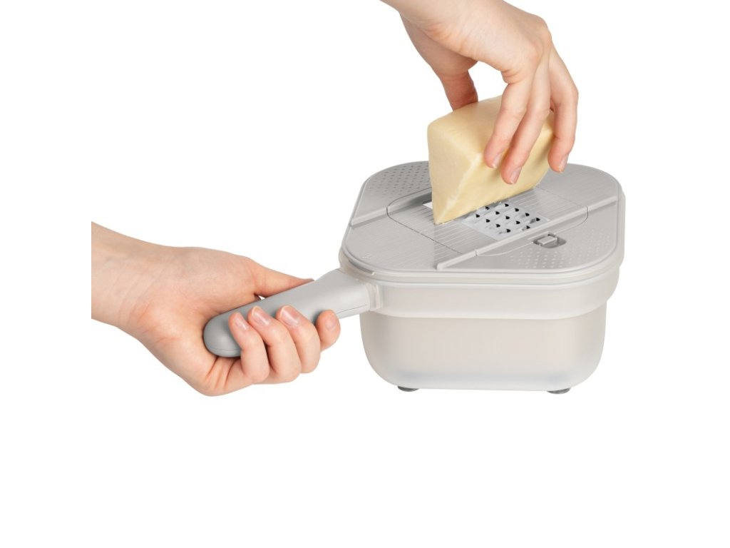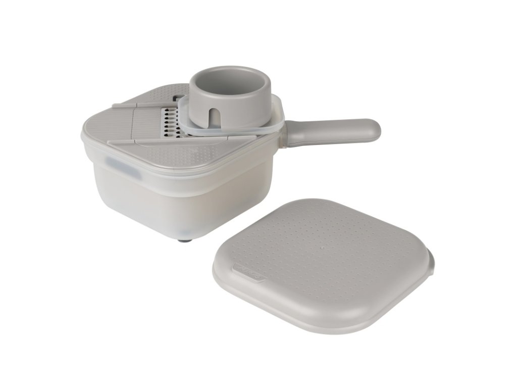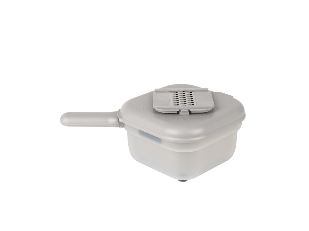 Tento multifunkční kráječ v elegantní krémové barvě je ideálním řešením pro rychlé a efektivní krájení různých druhů potravin. Díky třem vyměnitelným čepelím z nerezové oceli umožňuje snadné krájení podle potřeby, a zároveň slouží i jako úložná nádoba. Protiskluzové dno zajišťuje bezpečné používání bez posouvání během práce.