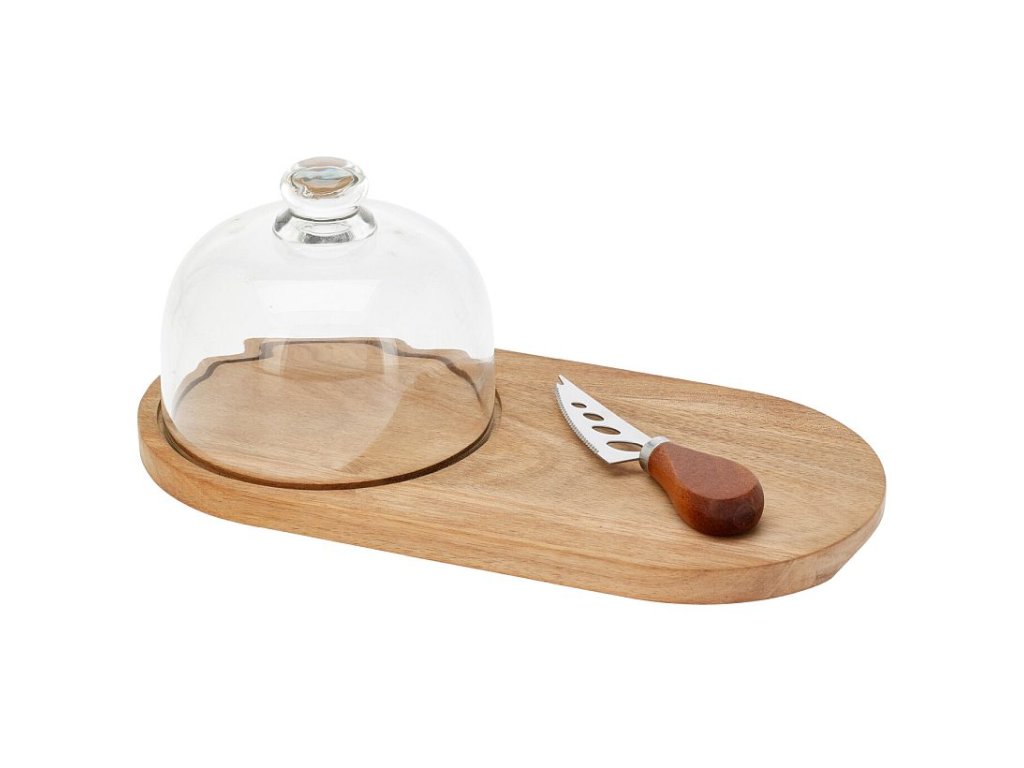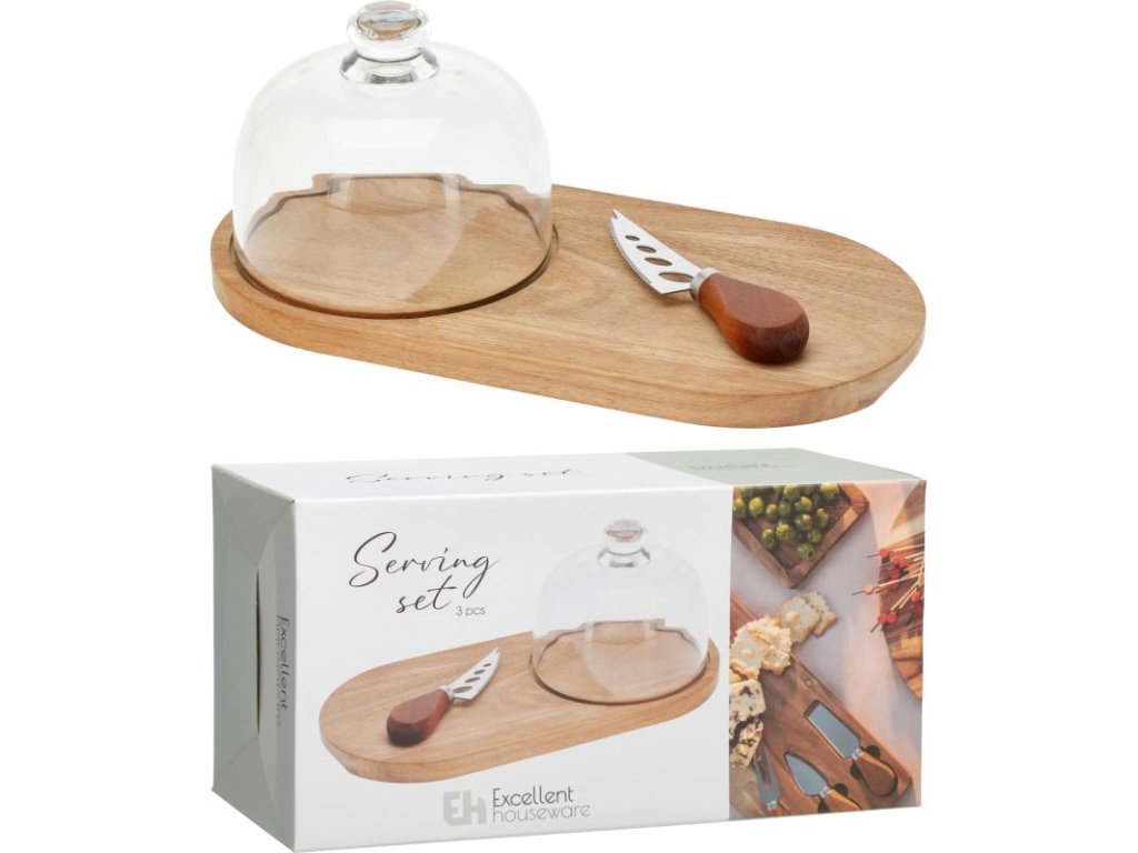 Servírovací sada 3 ks EXCELLENT – akátový tác se skleněnou kopulí a nožem na sýr