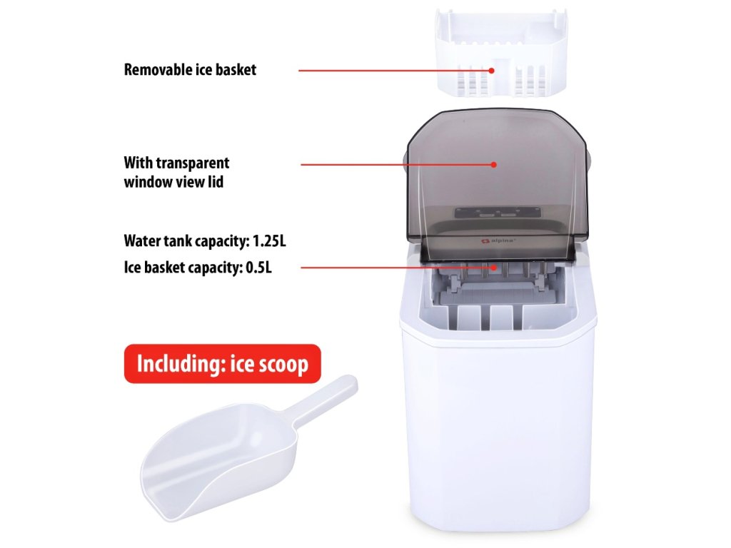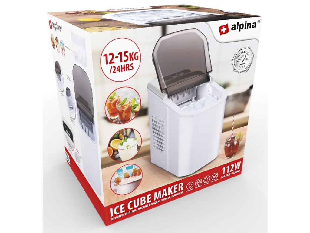 Stroj na ledové kostky – s výrobníkem ledových kostek Alpina máte obratem ruky dostatek ledu, abyste své nápoje ochladili.9 ledových kostek na cyklus – stroj na ledové kostky Alpina vyrábí 9 ledových kostek na cyklus. To trvá asi 10 až 12 minut na cyklus.Různé formáty ledu – přístroj na výrobu ledových kostek Alpina umí vyrábět dvě velikosti ledových kostek: velké (L) a malé (S). Velikost se nastavuje na horní straně výrobníku ledových kostek.LED displej – na horní straně výrobníku ledových kostek se nachází snadno ovladatelný LED displej. Tak můžete zvolit velikost ledových kostek, zjistit, zda je přístroj zapnutý a kdy je led hotový nebo zda potřebujete doplnit vodu.Průhledný kryt – díky průhlednému víku můžete jednoduše a rychle vidět, kdy je výrobník ledu připraven a vyprázdnit misku na led.Doplňkové parametry