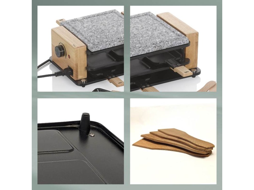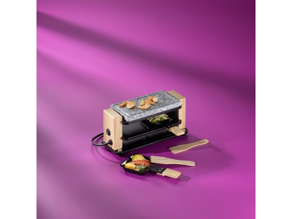 Udělejte své večery nezapomenutelné. S tímto elegantním raclette v přírodním dřevěném obalu vnesete na stůl nejen chuť, ale také extra dávku stylu. Žulová deska se snadnou údržbou je jako stvořená pro smažení zeleniny, masa a dalších pochutin přímo před vašima očima – snadno tak vykouzlíte kulinářské skvosty.