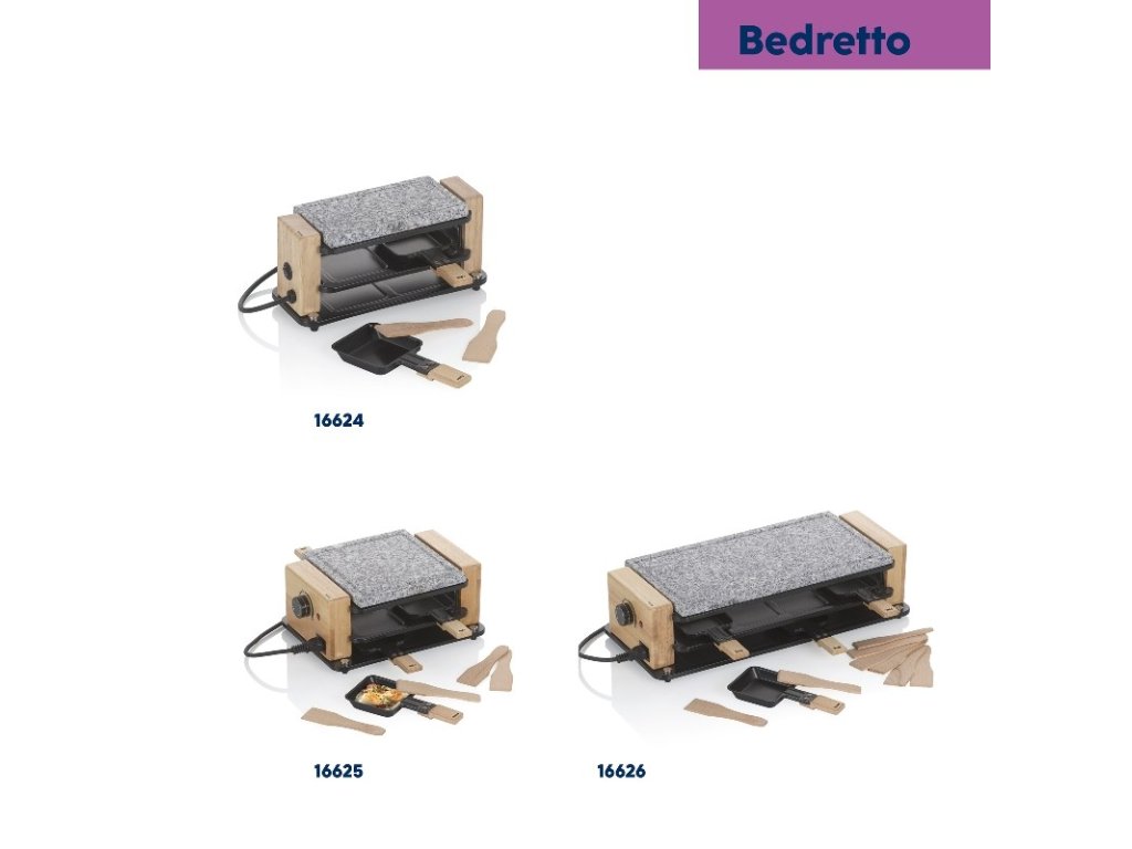 Díky plynule regulovatelnému přívodu tepla s kontrolkou máte teplotu vždy přesně pod kontrolou. Součástí sady jsou praktické pánve na raclette a lopatky.