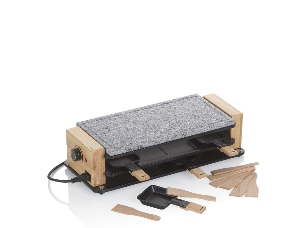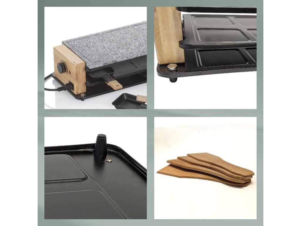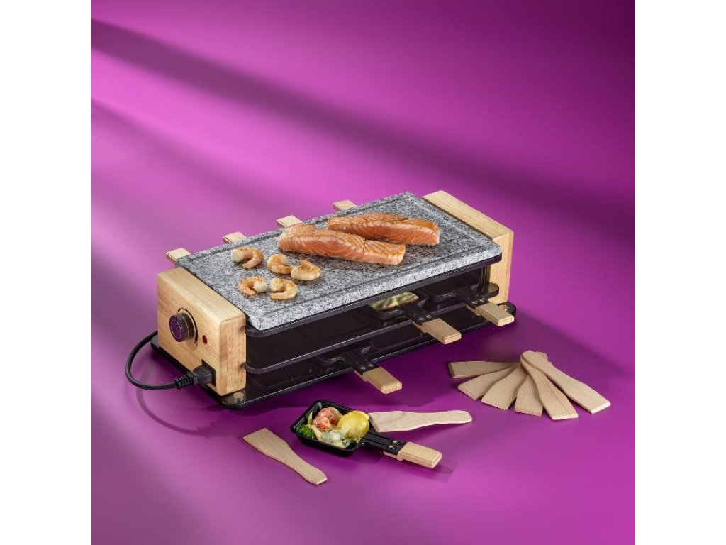 Udělejte své večery nezapomenutelné. S tímto elegantním raclette v přírodním dřevěném obalu vnesete na stůl nejen chuť, ale také extra dávku stylu. Žulová deska se snadnou údržbou je jako stvořená pro smažení zeleniny, masa a dalších pochutin přímo před vašima očima – snadno tak vykouzlíte kulinářské skvosty.